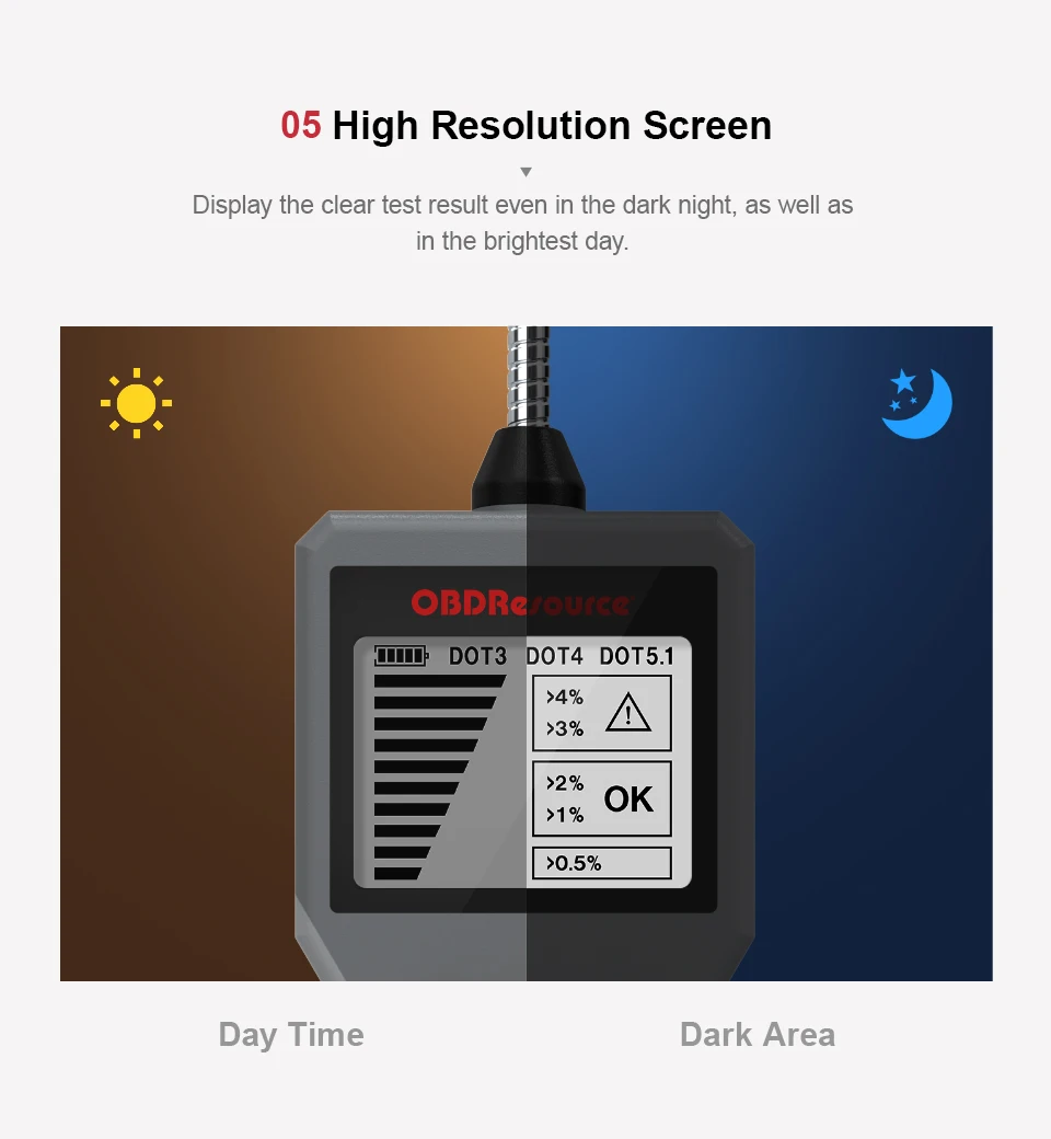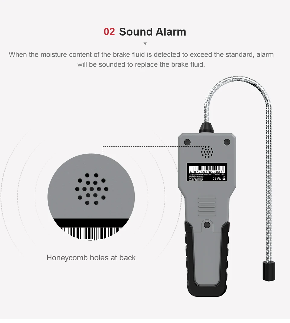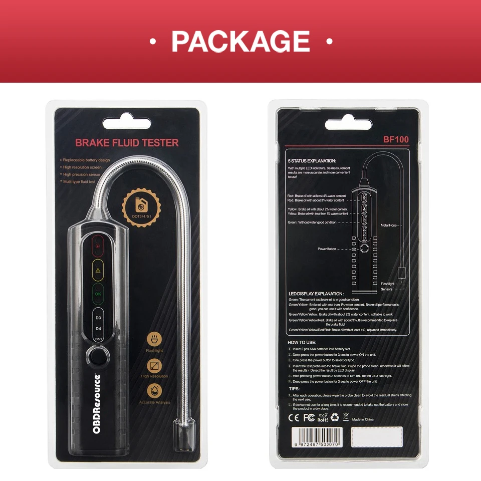 С несколькими светодиодный индикаторами результаты измерений более точные и удобные в использовании!Красный: тормозное масло с содержанием воды не менее 4%Красный: тормозное масло с содержанием воды около 3%Желтый: тормозное масло с содержанием воды около 2%Желтый: тормозное масло с содержанием воды менее 1%Зеленый: без воды хорошее состояние