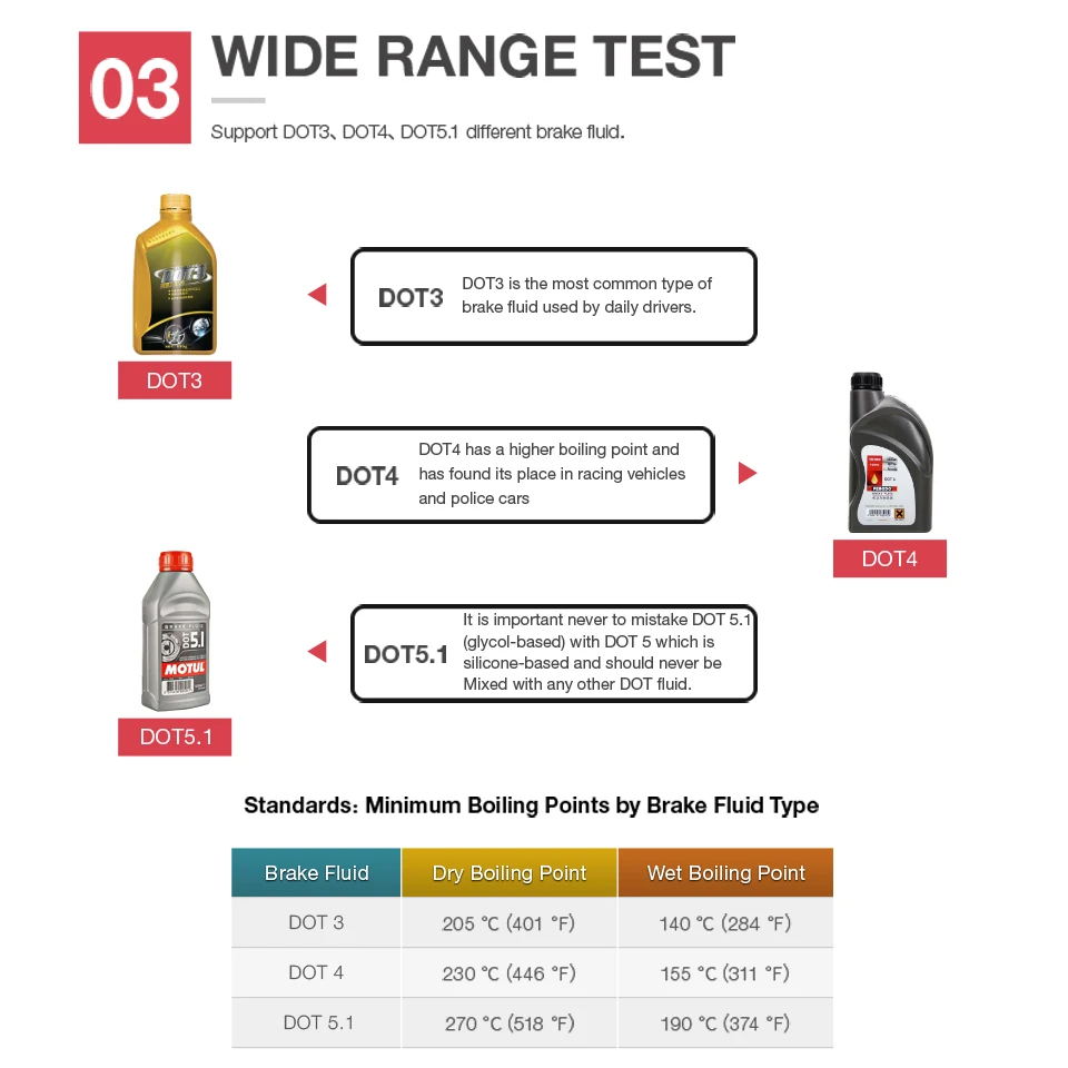 ● DOT3 является наиболее распространенным типом тормозной жидкости, используемой ежедневными драйверами.● DOT4 имеет более высокую температуру кипения и нашел свое место в гоночных автомобилях и полицейских автомобилях● DOT5.1: Важно никогда не ошибиться в DOT 5,1 (на основе гликоля) с DOT 5, который основан на sllicone и никогда не должен бытьСмешанный с любой другой точечной жидкостью.Стандарты: Минимальные точки кипения по типу тормозной жидкости