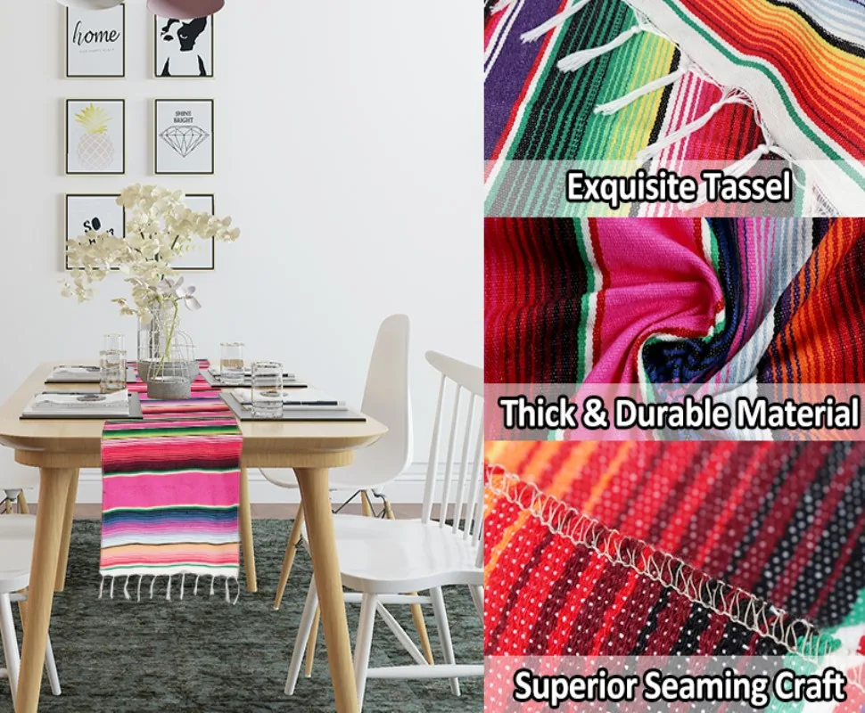 Мексиканский бегун serape имеет традиционный полосатый дизайн, с толстой тканой структурой и завязанными краями бахромы. Смелые цвета сразу делают столешницу более праздничной и в то же время служат дополнительным барьером между едой, жидкостью и столешницей. Легко моется и прочен.