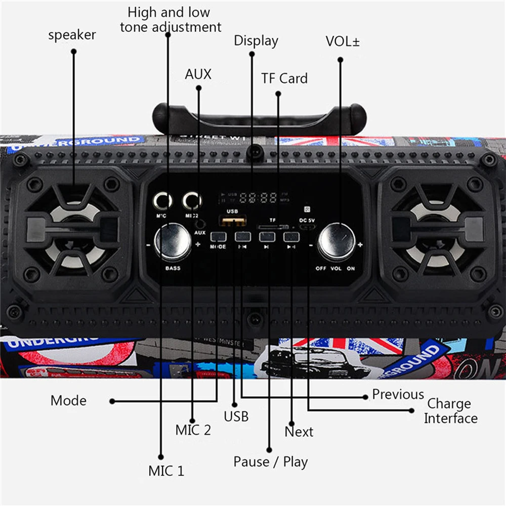 Размер: 377*158*150 ммОбъемный звук на 360 °, качество звука без шумаПоддержка проводной вставки микрофона, подключите микрофон в любое время, чтобы петьСовместимость с Bluetooth 4,2, расстояние до 10 м, может быть подключен к мобильным телефонам, планшету, компьютеру или ноутбукуВстроенная функция FM-радио, прослушивание популярного музыкального радио, простота в эксплуатацииЕмкость аккумулятора, 1500 мАч, 6 часов новой любви к непрерывному воспроизведению, выносливость и мощность