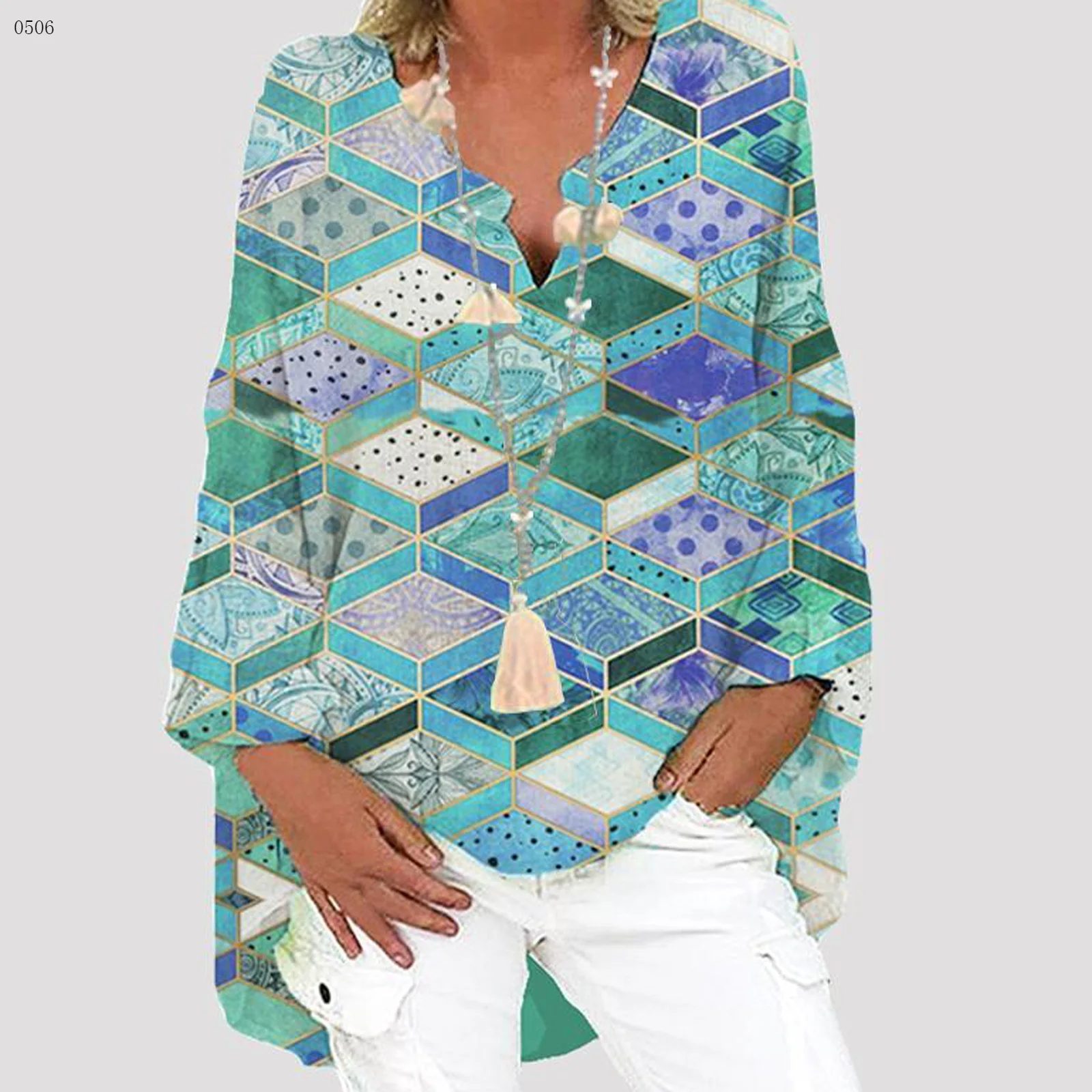 Женская блузка в клетку с геометрическим принтом и V-образным вырезом