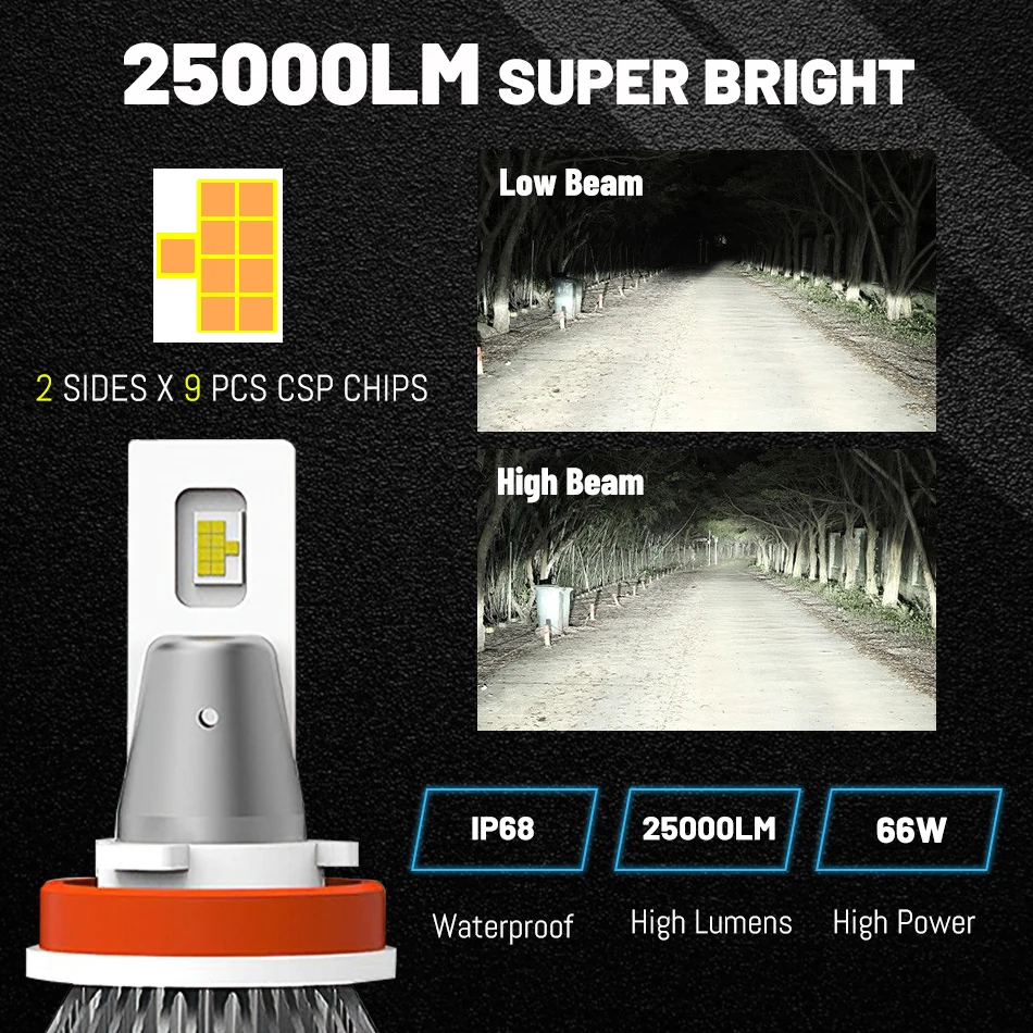 (1) светодиодная фара 25000 лм/пара, каждая лампа 12500 лм, очень яркая. (2) одна светильник имеет 2 стороны 9 чипов CSP. (3) изделие 6000k, чистый светильник. (4) мощность этого продукта составляет 66 Вт/пара, каждая лампочка-33 Вт.