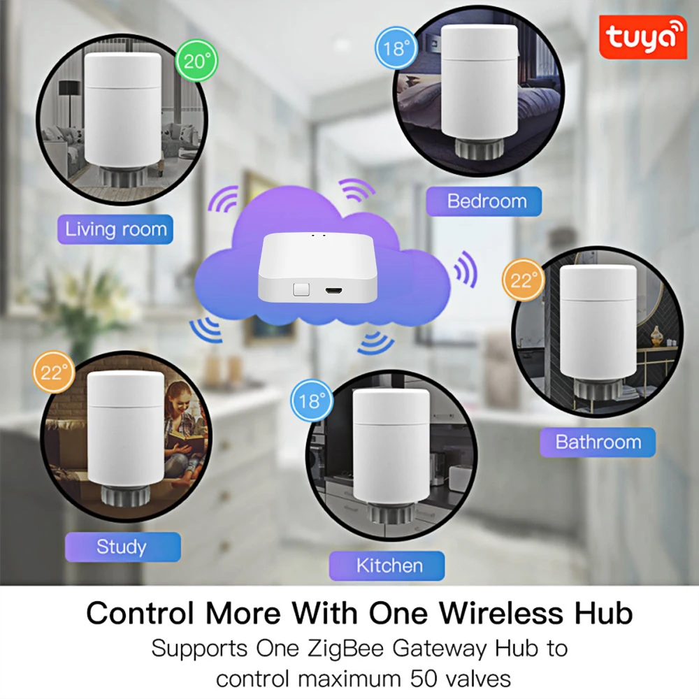 Шлюз Tuya Zigbee может управлять до 30 термостатами одновременно. Вы можете управлять каждым термостатом радиатора индивидуально или создать группу для управления всеми термостатами вместе. Вы также можете добавить другие подустройства Tuya Zigbee к этому шлюзу для интеллектуального управления.