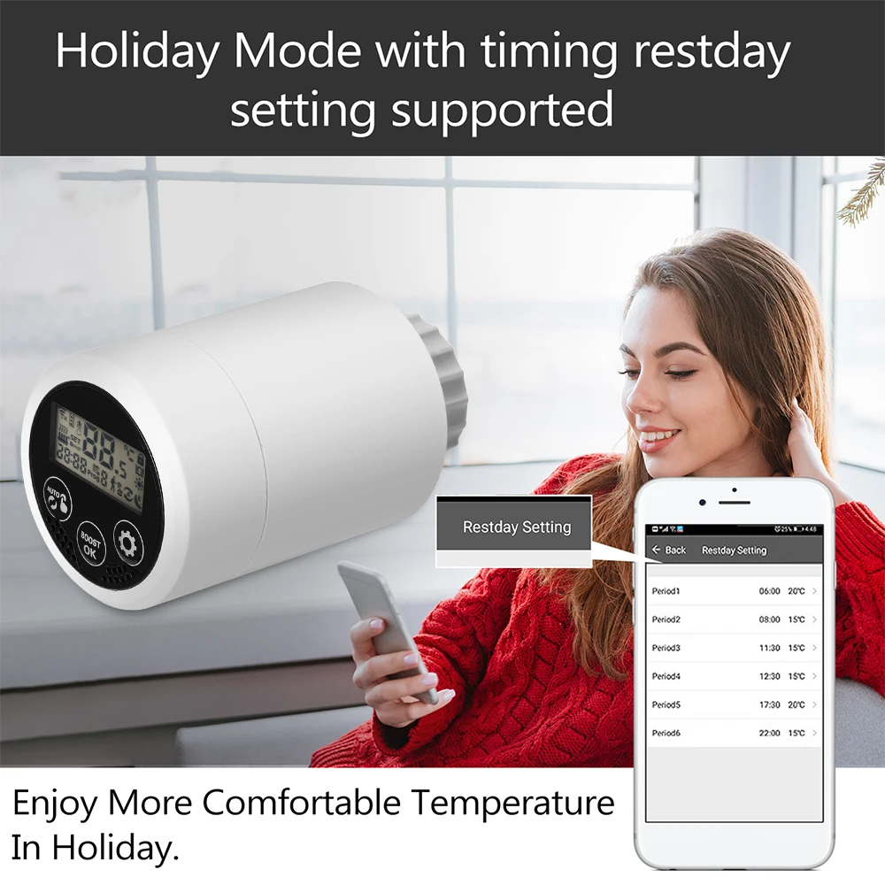 Этот термостатический клапан радиатора поддерживает еженедельное Программирование 5 + 2/6 + 1/7, которое вы можете установить максимум 6 периодов в день с разным временем и температурой для каждого периода, тогда это будет автоматический Еженедельный цикл.