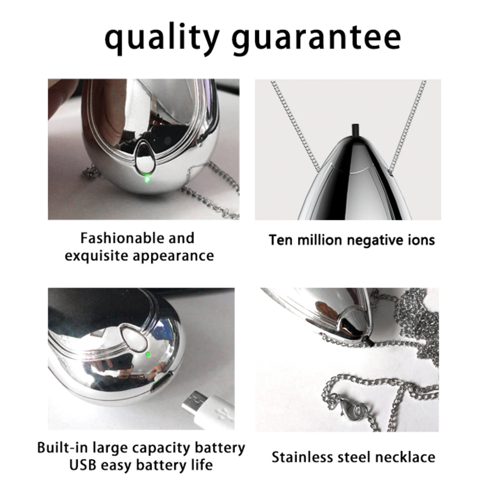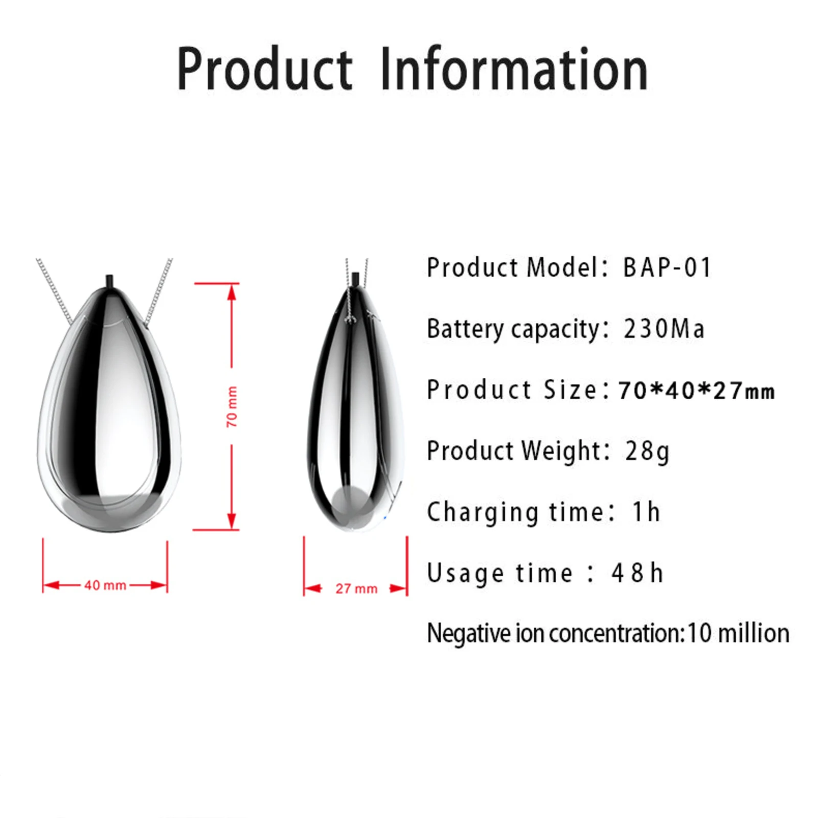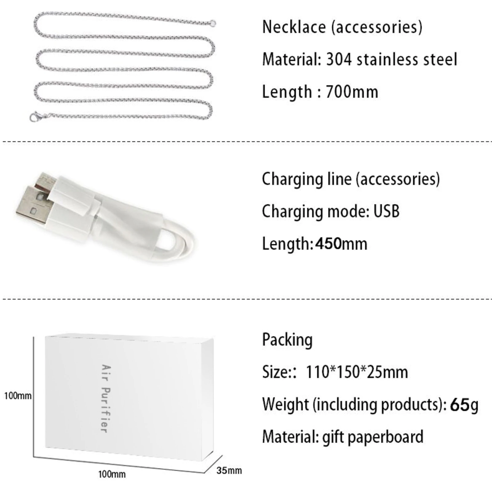 Особенности: ЭффективныйОтрицательная ионная концентрация достигает 20 миллионов на кубический сантиметр. Он может удалить PM2.5, устранить запах дыма и эффективно очистить воздух. И это обеспечит качество воздуха и обеспечит комфортную среду. ТихийКогда отрицательный ионный очиститель воздуха работает, он находится в очень бесшумном состоянии. Он имеет высокую эффективность очистки, но его рабочий звук низкий. Благодаря низкой децибел-среде, которую он предлагает, вы можете наслаждаться тихой окружающей средой. ПортативныйНосимый очиститель воздуха-это светильник небольшого размера и веса. Его легко использовать и можно повесить на шею. Это не займет много места и не принесет чувство нагрузки. Очень удобно в использовании. Долгое время работыОчиститель воздуха имеет встроенный аккумулятор. Он имеет длительное время работы. После полной зарядки, он используется для более чем 20 часов. Он будет в значительной степени соответствовать использованию на открытом воздухе. ПрименениеОсвежитель воздуха имеет широкий спектр применения. Его можно использовать дома, в офисе, в автомобиле. Или вы можете использовать его на открытом воздухе. Он прочный и практичный, с длительным сроком службы. Характеристики:Тип изделия: очиститель воздухаМатериал: АБС-пластикЦвет: серебристыйКоличество: 1 шт.Емкость батареи: 200 мА литиевая батареяОтрицательная ионная концентрация: 20 миллионов на кубический сантиметрВремя работы: 20-24 чВремя зарядки: 1 чОбласть применения: менее 10 квадратных метровРазмер изделия: 7*4*2,7 см/2,75*1,57*1,06 дюймов (Д * Ш * В)Вес: 28 г/0,99 унций Посылка:1 * очиститель воздуха1 * зарядный кабель1 * ожерелье1 * коробка для посылка