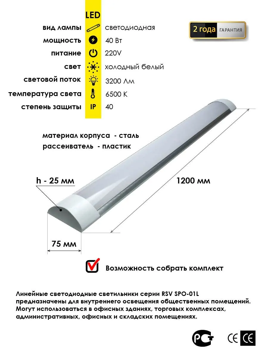 Светильники светодиодные серии RSV 40W предназначены для работы в сетях переменного тока с напряжением 175-265 В в частоты 50 Гц., ГОСТ Р МЭК 60598-1-2011.Светодиодные светильники серии RSV 40W предназначены для внутреннего освещения общественных помещений. Могут использоваться в офисных зданиях, торговых комплексах.