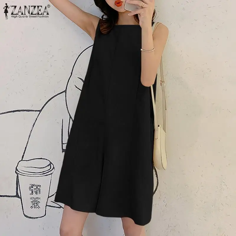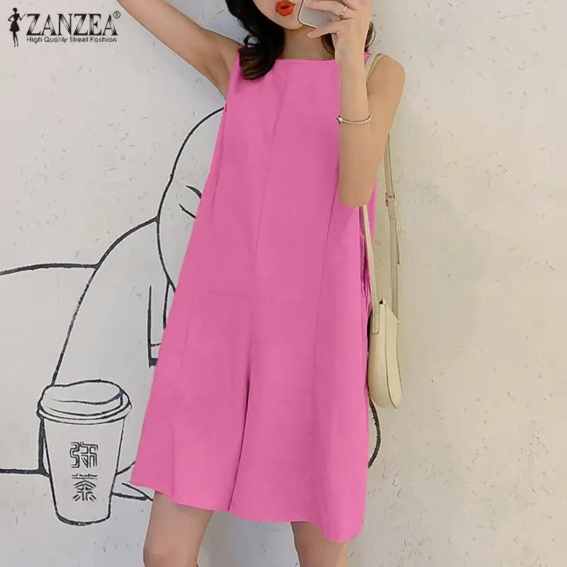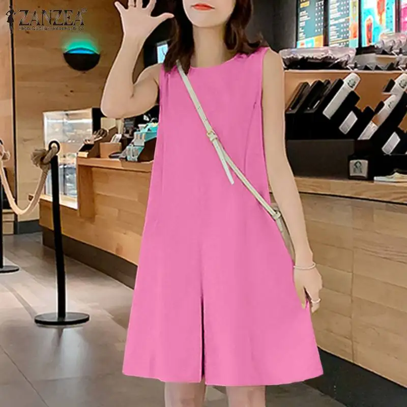 Лето 2021, комбинезон ZANZEA без рукавов, Женский однотонный комбинезон с круглым вырезом, повседневные короткие комбинезоны с широкими штанинами, женские свободные комбинезоны OL