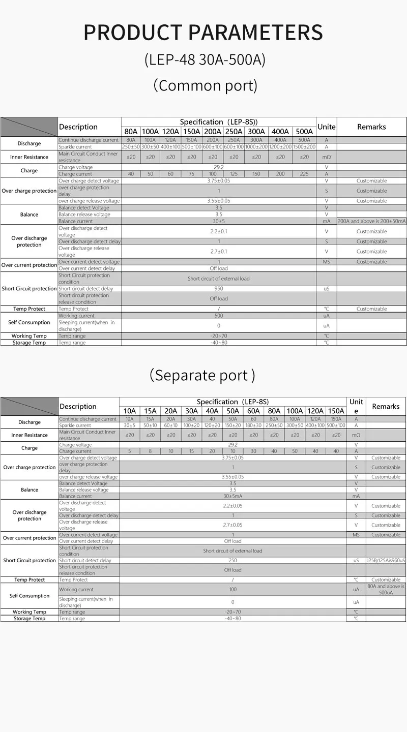 Примечание: для той же модели ток заряда меньше тока разряда, так как платы Daly были обновлены для надежной защиты аккумулятора клиента. По любым вопросам, пожалуйста, свяжитесь с нами.1. Обзор◆ Мы можем конструировать его для различных литиевых батарей, таких как LiFepo4, LiMn2O4, и Li-polymer и т. Д.◆ Основные функции: защита от перезарядки, защита от разрядки, защита от перегрузки по току, защита от короткого замыкания, защита от температуры и т. д.◆ Согласно запросу клиента мы можем разработать PCM в различных размерах и структурах.◆ BMS изготовлено высококачественными импортными МОП и ИС. Длительный срок службы батареи.2. Преимущество◆ Используйте высококачественную (A-level) Защитную интегральную схему IC, от решения Seiko из Японии.◆ Высокая нагрузка, ток постоянная разрядка А, а, сопротивление высокого напряжения, низкое внутреннее сопротивление мощности полевого МОП-транзистора. Радиатор значительно поможет охлаждать.◆ IC сам имеет функцию балансировки мощности. Схема проста и надежна.◆ Типичное Определение напряжения для каждой ячейки. Таким образом, каждый аккумулятор не будет перезаряжен или разряжен. Функция защиты от перегрузки по току и короткого замыкания очень надежная. Длительное короткое замыкание нагрузки не влияет на печатную плату и аккумулятор. Температурная защита во время зарядки и разрядки.◆ Очень низкое энергопотребление. Потребление всего устройства составляет менее 50 мкА.◆ На печатной плате используется высокая защита от коррозии, Высокая водонепроницаемость, высокое сопротивление ESD конформное покрытие.
