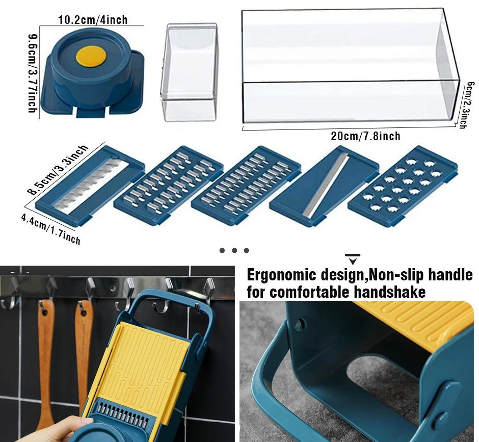2. Кухонный помощник: Этот ручной слайсер изготовлен из нержавеющей стали и АБС-пластика без BPA. Он предлагает все функциональные возможности нескольких приборов со сменными нержавеющими лезвиями. Эти лезвия можно разрезать через все виды овощей, терка сыра, нарезки картофеля и резки фруктов, даже можно креатепаста-как овощи или пюре.