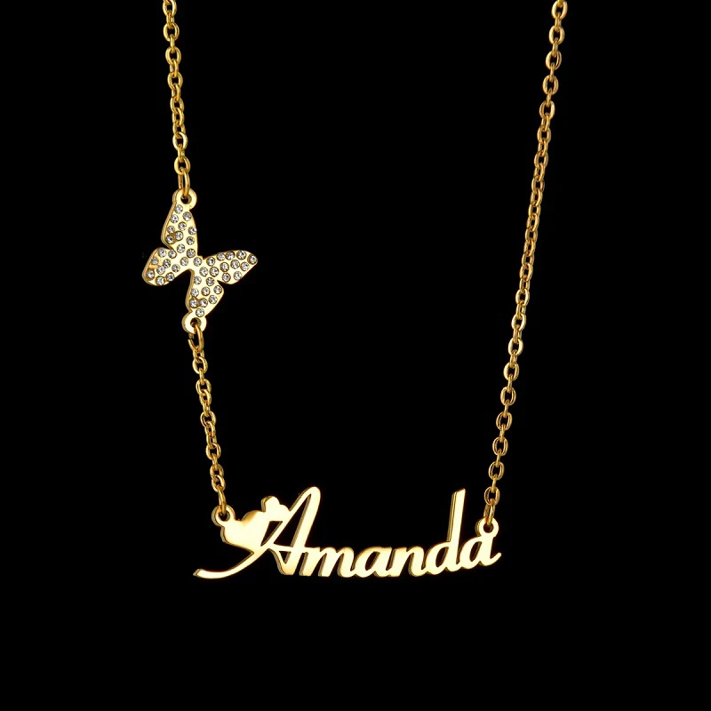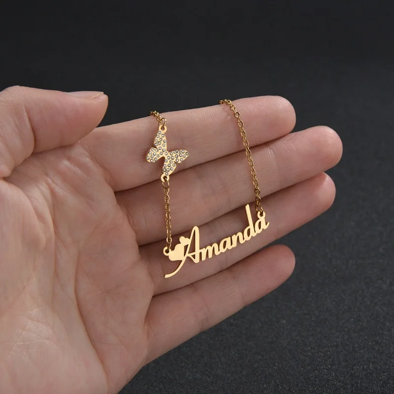 Letdiffery индивидуальные Бабочка Название с бриллиантами ожерелье ювелирные изделия нержавеющей стали Золотое колье для женщин табличка Ювелирные изделия Подарки