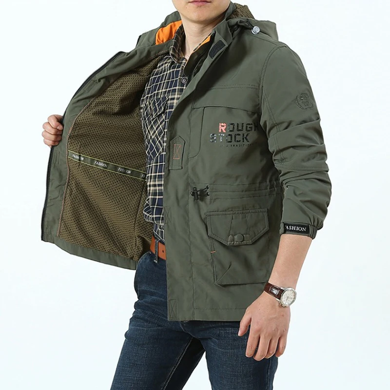 Куртка мужская демисезонная, с капюшоном и несколькими карманами, в...