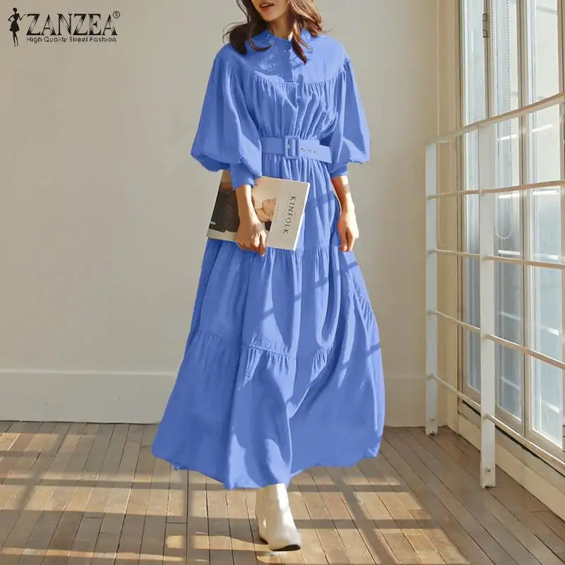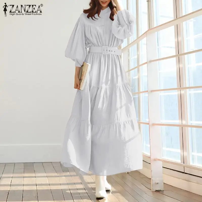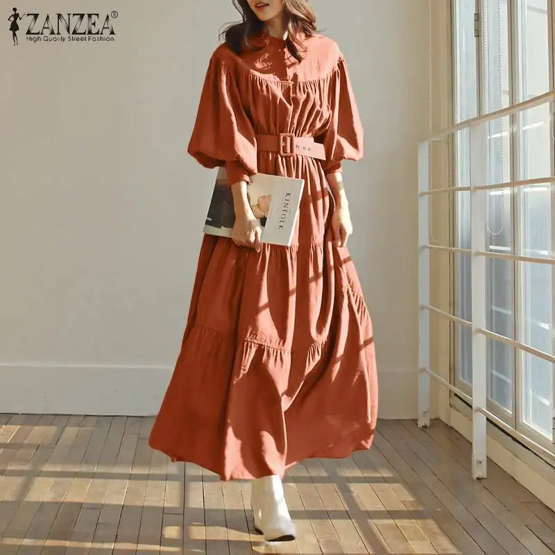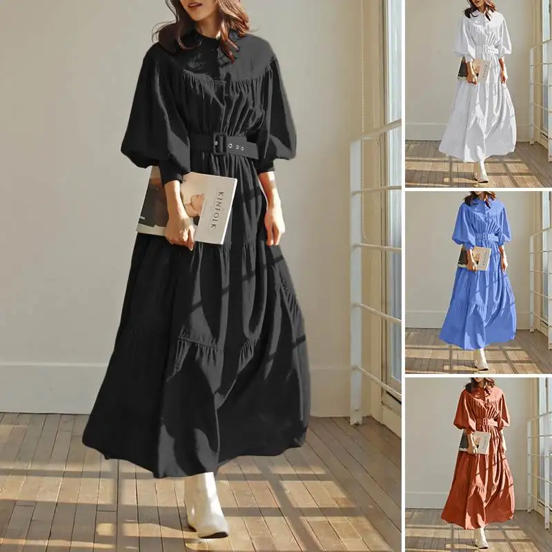Элегантное однотонное платье-рубашка, женский весенний сарафан, повседневное Макси-Платье с пышными рукавами и поясом, халат с оборками