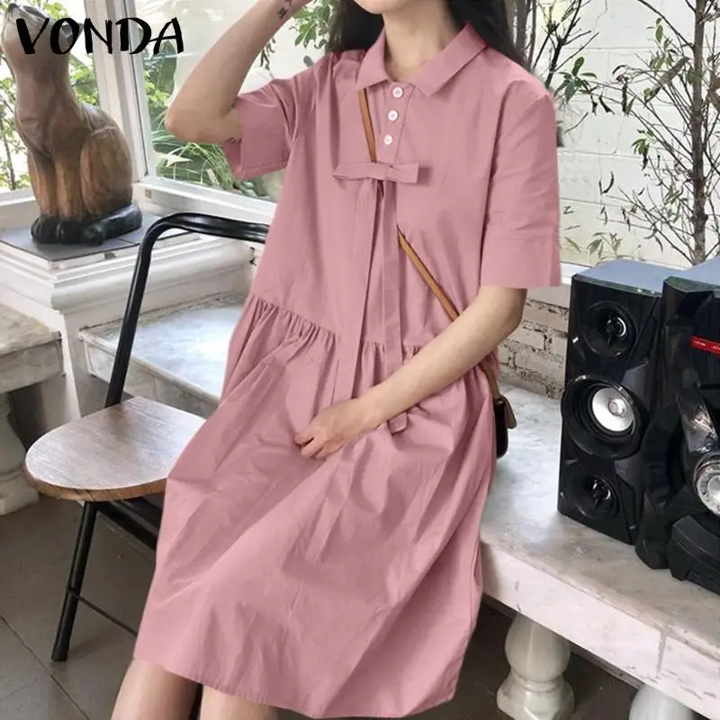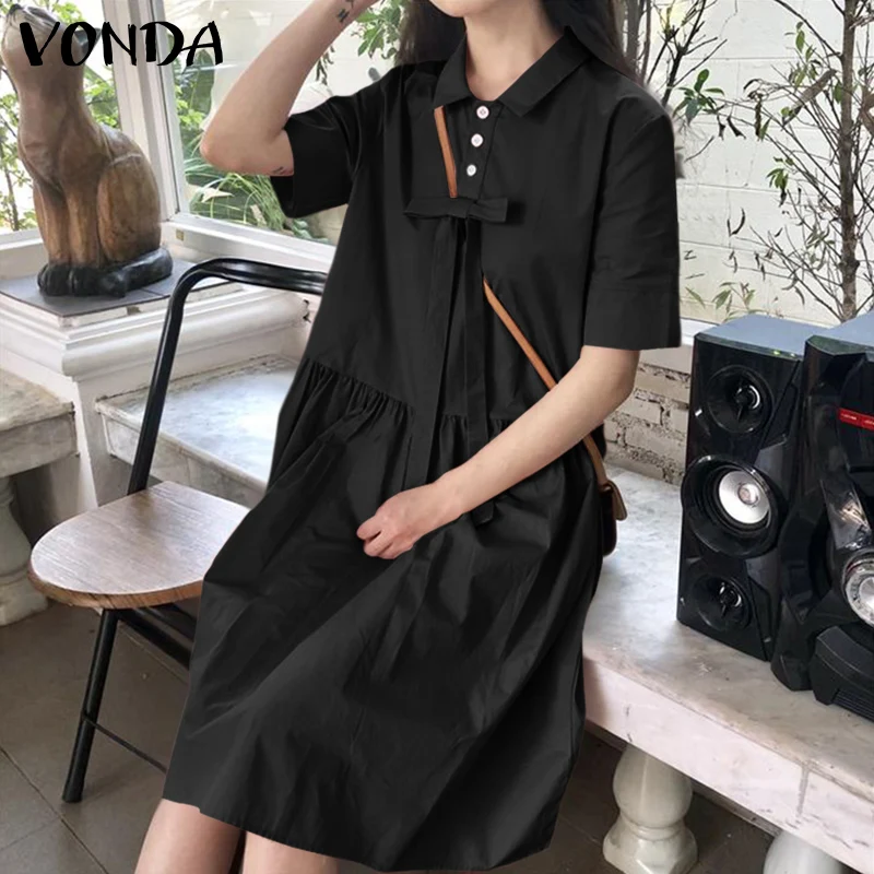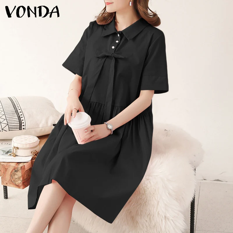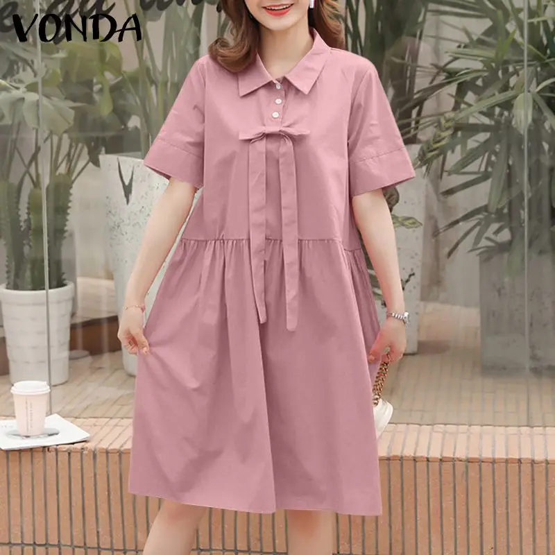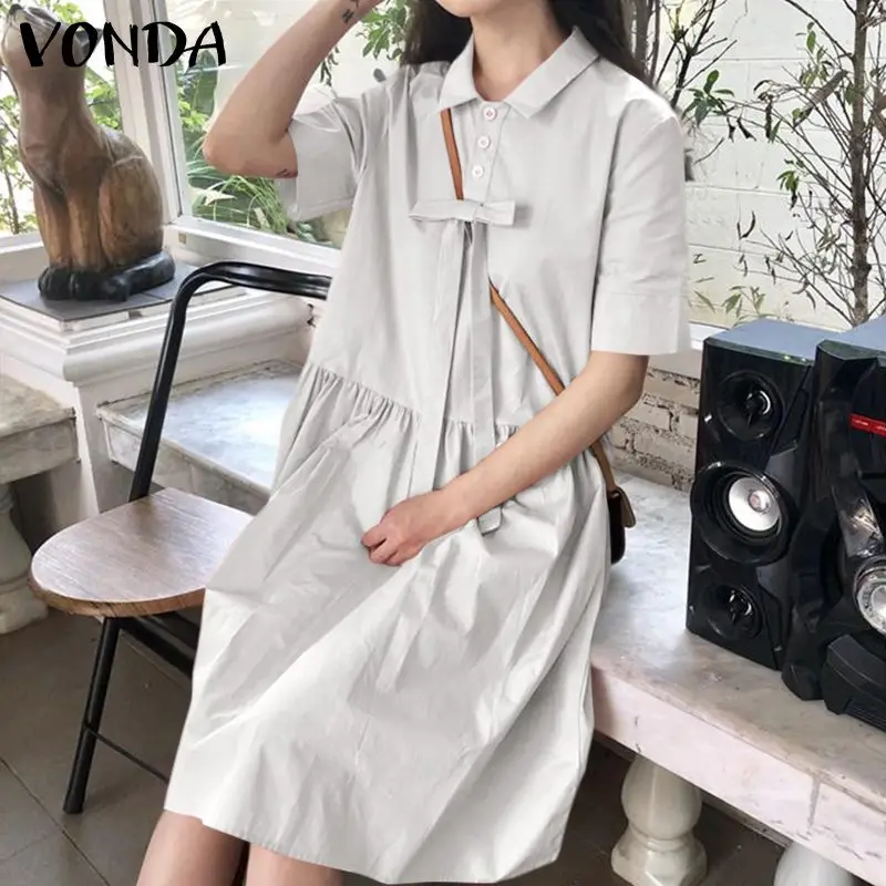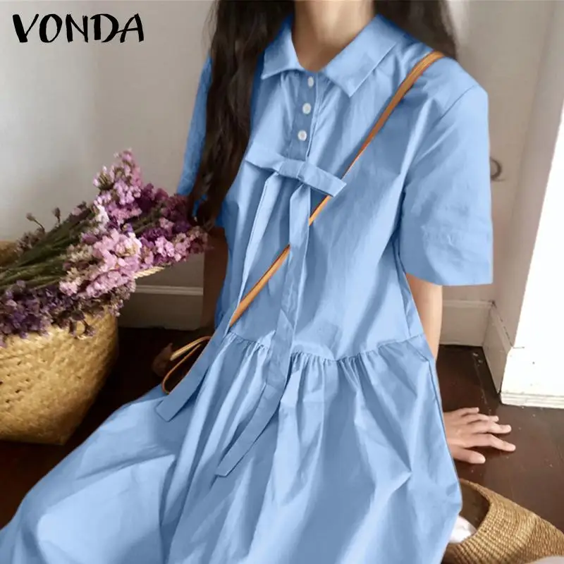 Женское офисное платье до колен, винтажное платье-рубашка с коротким рукавом, отложным воротником и пуговицами, 2021 VONDA, повседневные платья S-