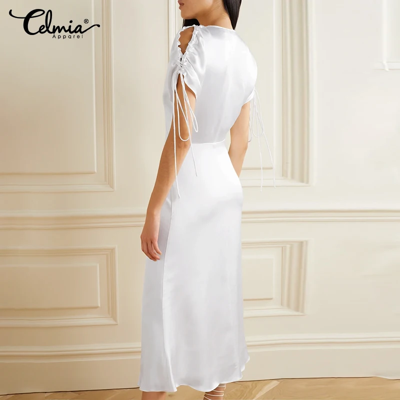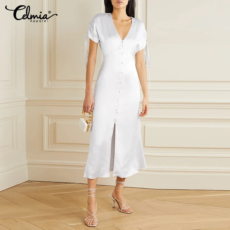 Элегантные женские ремни на манжетах с короткими рукавами вечерние платье Celmia летнее платье с v-образным вырезом атласная Разделение Hem Vestidos пуговицы модные тонкие миди платье