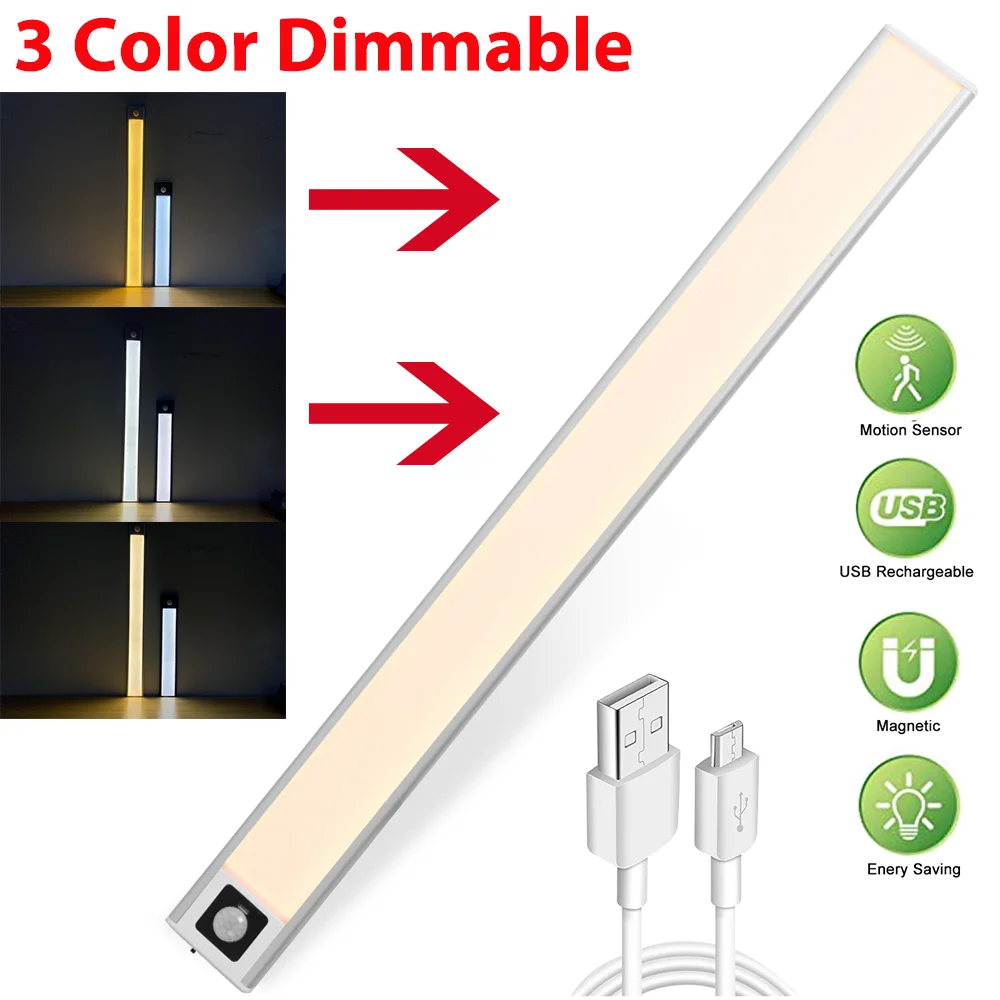 Светильник для шкафа с регулируемой яркостью, 3 цвета, светодиодный светильник для кухни с пассивным инфракрасным датчиком движения, светодиодный светильник с зарядкой по USB, в алюминиевом корпусе, ночник