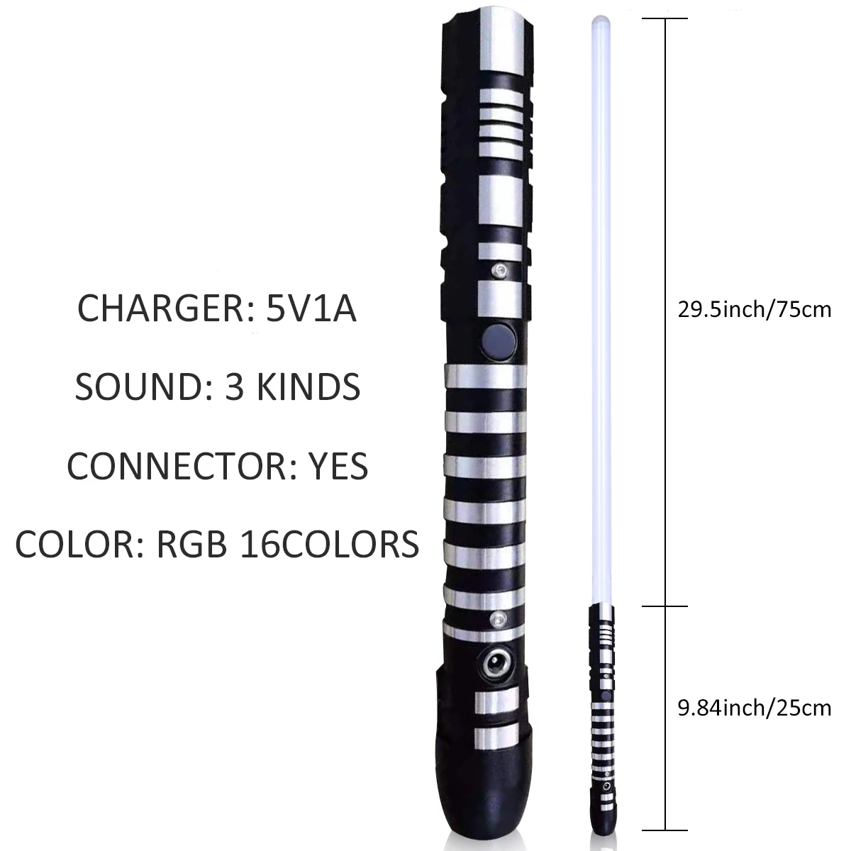 Материал: алюминиевый сплав, высококачественный ПКОбщая длина: 37,79 дюйма/96 смДлина ручки: 9,84 дюйма/25 смДлина лезвия: 29,52 дюйма/75 смДиаметр: 1 дюйм/3 смЗвук: 3 вида звуков/1 вид звуковЦвет лезвия: RGB 16 цветов, красный, синий, зеленый, фиолетовый, белый, голубой, желтыйЦвет ручки: черныйВремя зарядки: 2-3 часаНапряжение зарядки: 5 В (макс.)Батарея: 18650 3,7 V Перезаряжаемые литиевая батарея БатареяЕмкость аккумулятора: 1000AhИзюминка: 9 Вт/5 ВтЗарядное устройство: 5V1AРегулировка громкости: высокая, средняя и низкая Регулировка громкости, функция отключения звукаФункция памяти: светильник с эффектом памяти, звуковая память...Разъем: Да