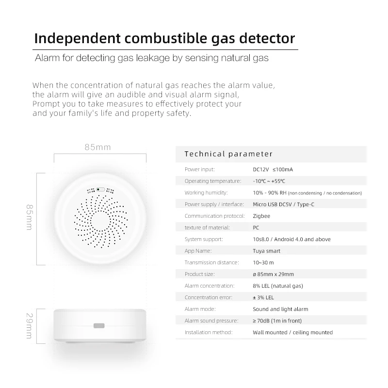 【 Обнаружение двойного датчика в реальном времени 】 датчик горючего газа, который может контролировать концентрацию природного газа в окружающей среде в реальном времени. Высокочувствительный датчик температуры, Точная передача информации о тревоге.【Звуковая и светильник вая сигнализация при обнаружении того, что концентрация природного газа в воздухе достигает стандарта, детектор будет звуковым сигналом до 72 децибел и излучать красный светильник, мигающий сигнал тревоги, И отправьте сигнал тревоги хосту, и сообщите информацию мобильный телефон пользователя.【Сцена ссылка 】 реализовать предустановленные сценарии безопасности через мобильное приложение. Как только Контролируемая концентрация природного газа достигнет 8% Лель, будет выдан сигнал тревоги удаленно. Когда будет достигнута соответствующая концентрация, шлюз связи отправит локальный звуковой и светильник вой сигнал, а мобильный телефон получит уведомление о push-уведомлении через приложение, чтобы вовремя уведомить вас, И мобильный телефон может открыть окно через Открыватель окна. (Открыватели окон и шлюзы в комплект не входят.) 【Высокочувствительное Обнаружение 】 с использованием слаботочных газовых датчиков, встроенный модуль температурной компенсации с высокой чувствительностью, точной сигнализацией для предотвращения пожарных аварий. 【Многофункциональное применение 】 детектор дыма может нормально работать в домах, отелях, магазинах, офисах и квартирах. Защищает каждый момент. [Требуется] Этот продукт подходит только для шлюза Tuya.Характеристики:Рабочее напряжение: 12 В постоянного тока <100 мАРабочая температура: -10 °C-+ 55 °CРабочая влажность: 10% ~ 90% относительной влажности (без конденсации)Интерфейс источника питания: Micro USB DV5V/Type-CПротокол связи: Zigbee (требуется концентратор)Материал: ПКПоддержка системы: l0S8.0/Android4.0 и вышеНазвание приложения: Smart Life/TUYAРазмер продукта: 85*85*29 ммКонцентрация сигнала тревоги: 8% Лель (природный газ)Погрешность концентрации: плюс или минус 3% ЛельРежим тревоги: Звуковая и светильник вая сигнализацияЗвуковое давление сигнала тревоги: >= 70 дБ (1 метр прямо перед)Способ установки: стена/потолокПосылка1 * Детектор природного газа