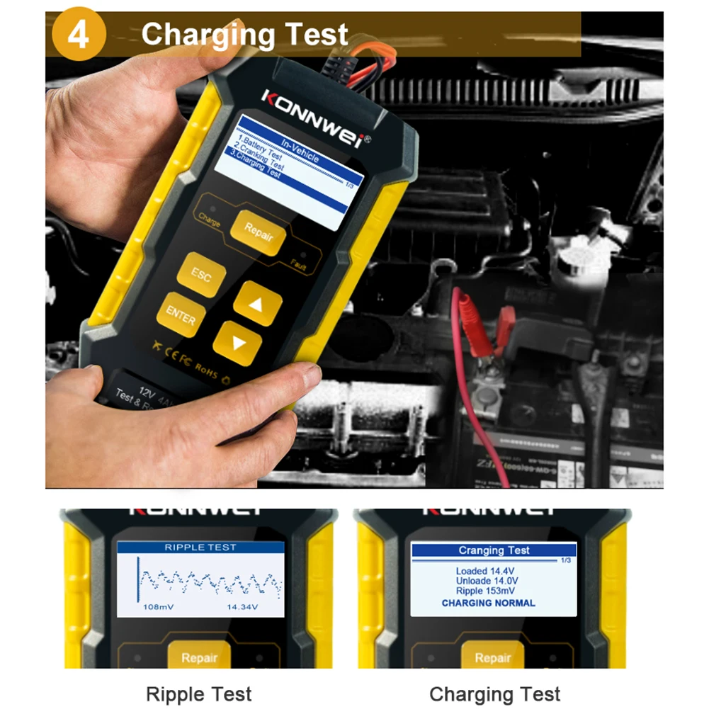 * 2. Тест на систему подзарядки транспортного средства, время сгибания, напряжение и состояние; Система зарядки транспортного средства тестирует напряжение нагрузки, напряжение разгрузки, состояние пульсации и состояние системы зарядки.