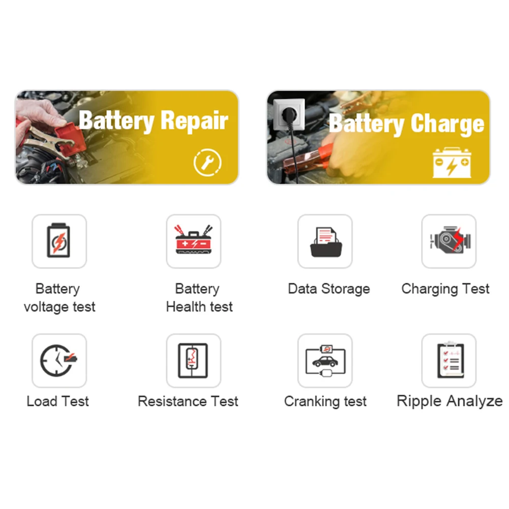 * 1. Тест батареи в/из транспортного средства точные результаты в миллисекундах, результаты анализа с хорошим или заменить. Применимо ко всем автомобильным свинцово-кислотным батареям, включая обычные свинцово-кислотные батареи, AGM плоские батареи, AGM спиральные батареи, EFB и гелевые батареи и т. д. на основе CA, CCA, BCI, стандарты MCA, JIS, SAE, EN, DIN и IECS.