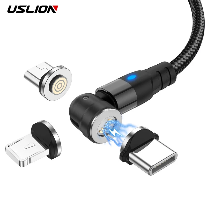 Магнитный кабель USLION 540 градусов Type C для передачи данных, быстрая зарядка, магнитный телефонный кабель Micro USB для iPhone 12 Xiaomi, провод, шнур, кабель