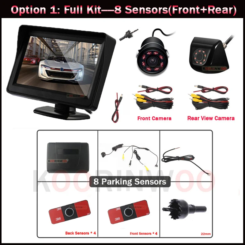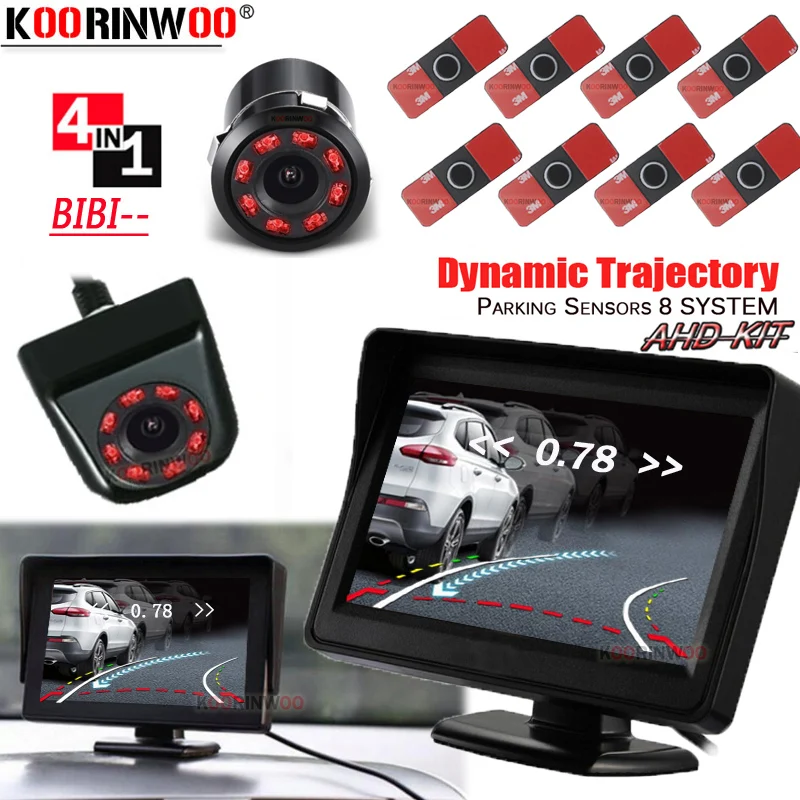 Парктроник Koorinwoo, динамическая траектория, камера багажника Передняя комплект автомобильных датчиков парковки с 8 сенсорами, Видеосистема с монитором