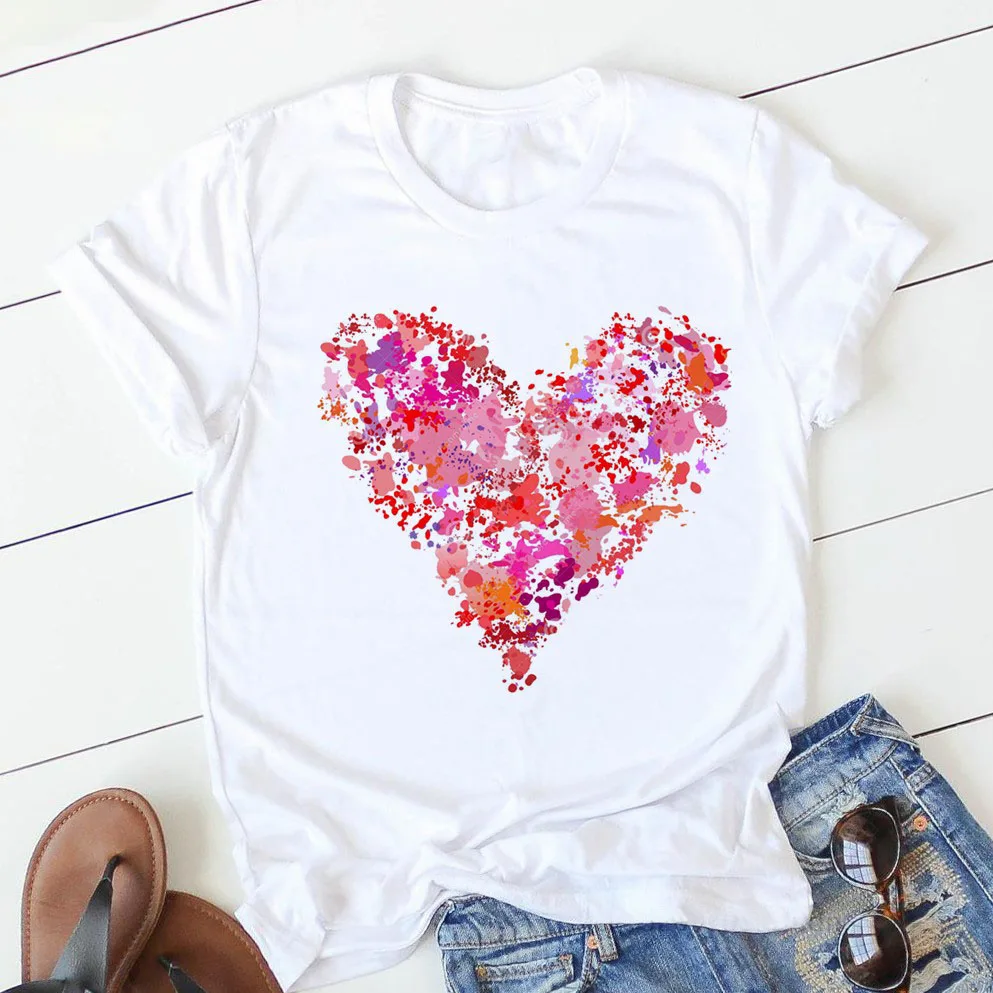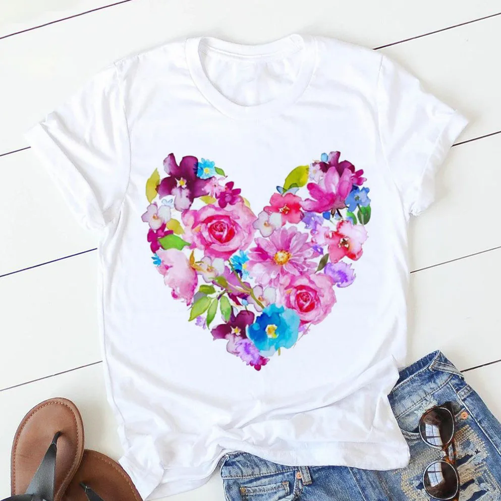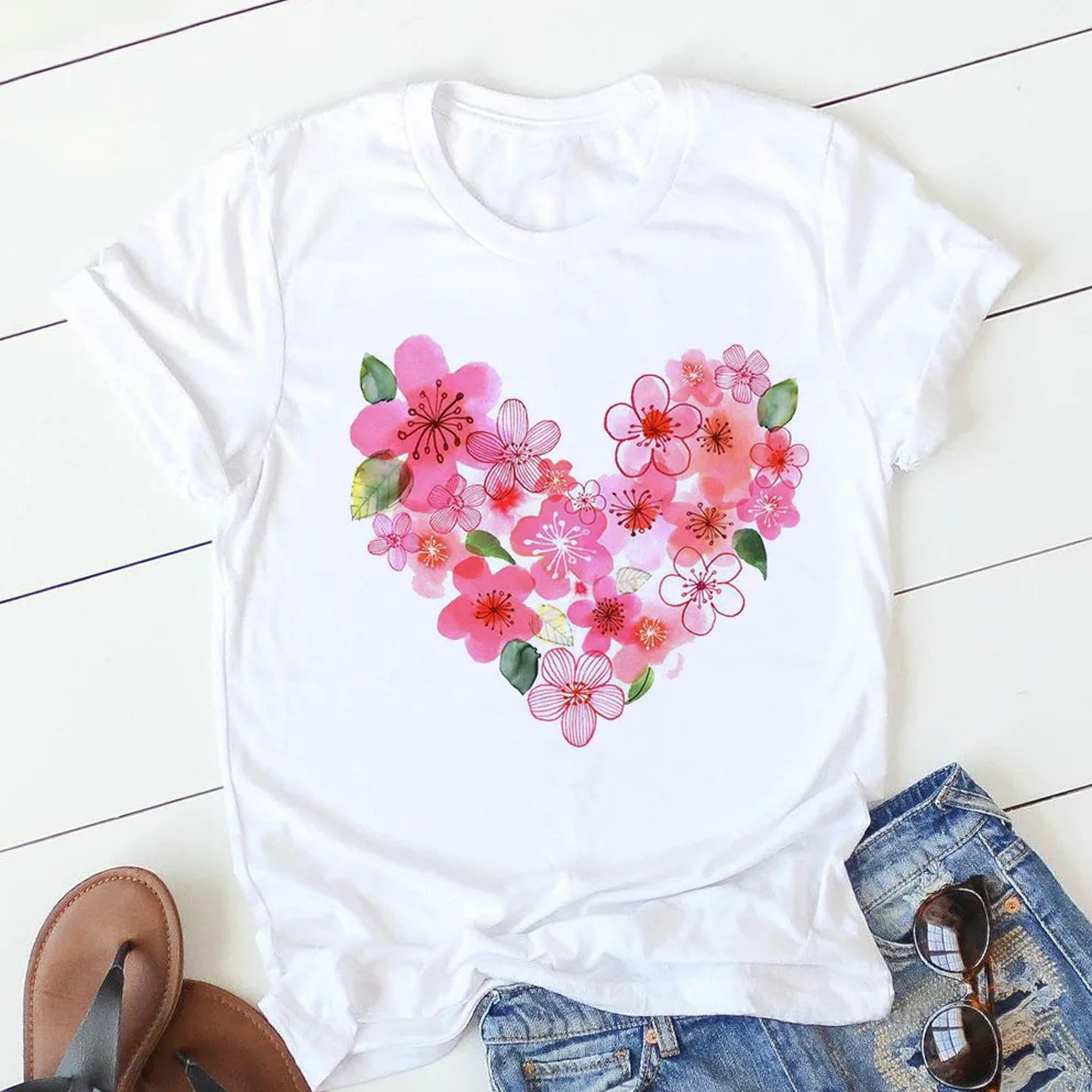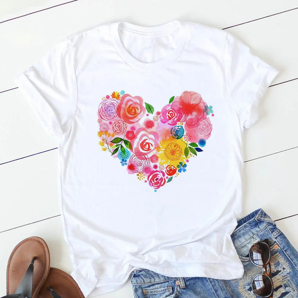 Футболка женская с принтом сердца и цветов, одежда с коротким рукавом, милый топ с рисунком, одежда для женщин, лето 2021