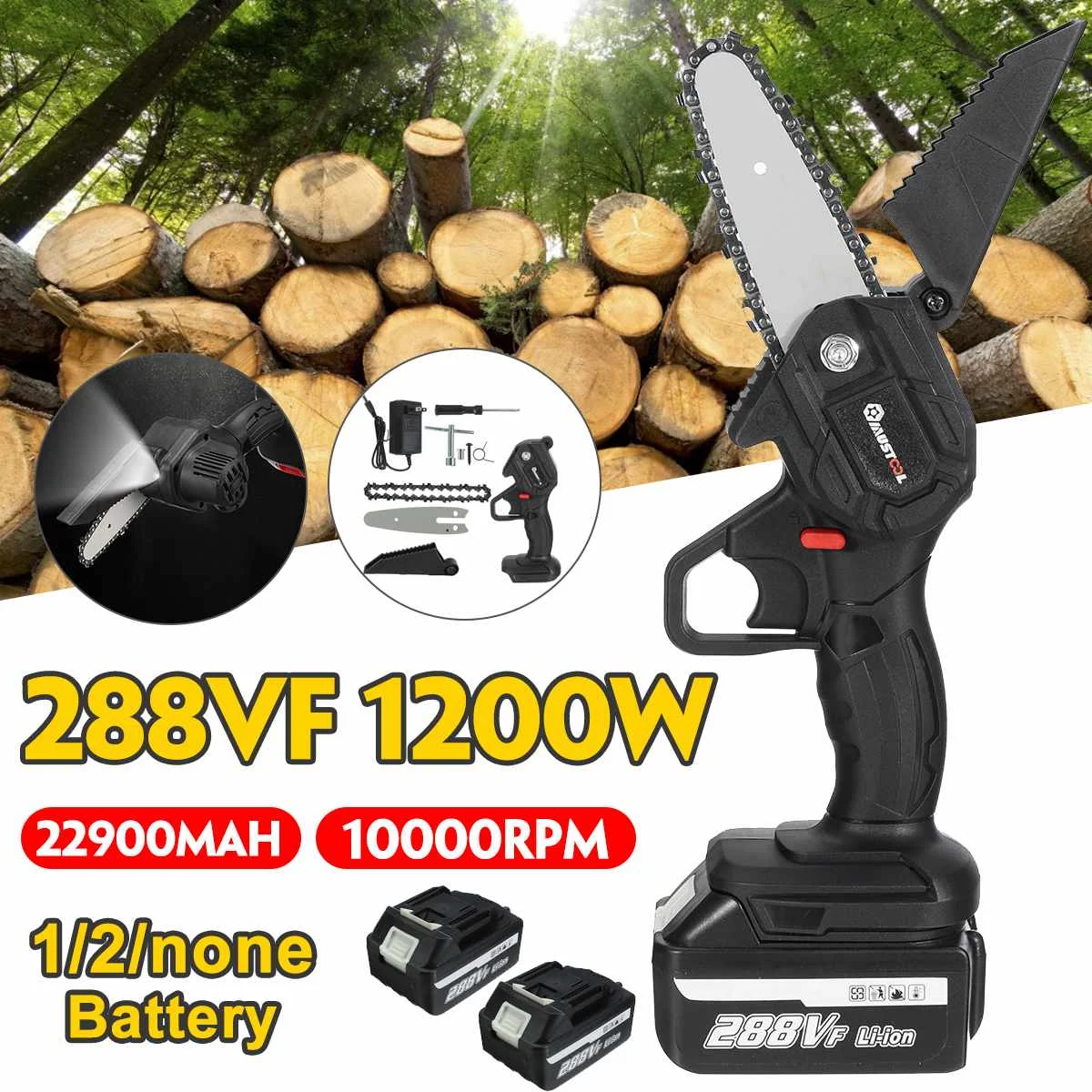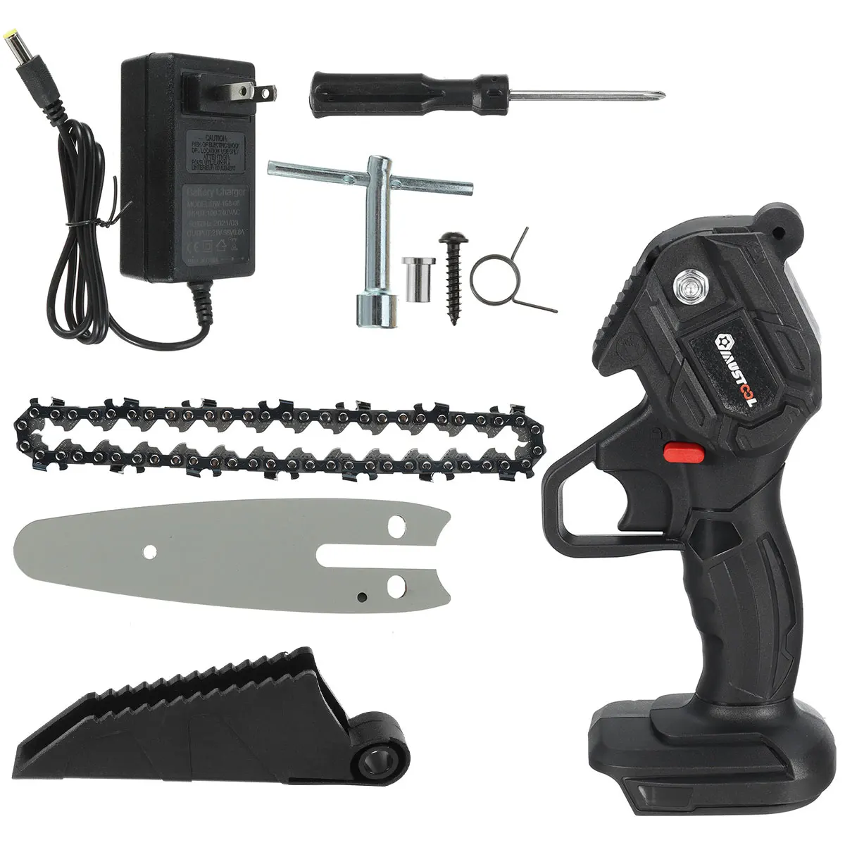 Посылка включает в себя:Тип A1 хост с перегородкой1 x цепь1 x направляющая пластина1 x литий-ионный аккумулятор1 х гаечный ключ1 отверткаЗарядное устройство с вилкой EU/US-1 шт.1 х Руководство1 х упаковочная коробка