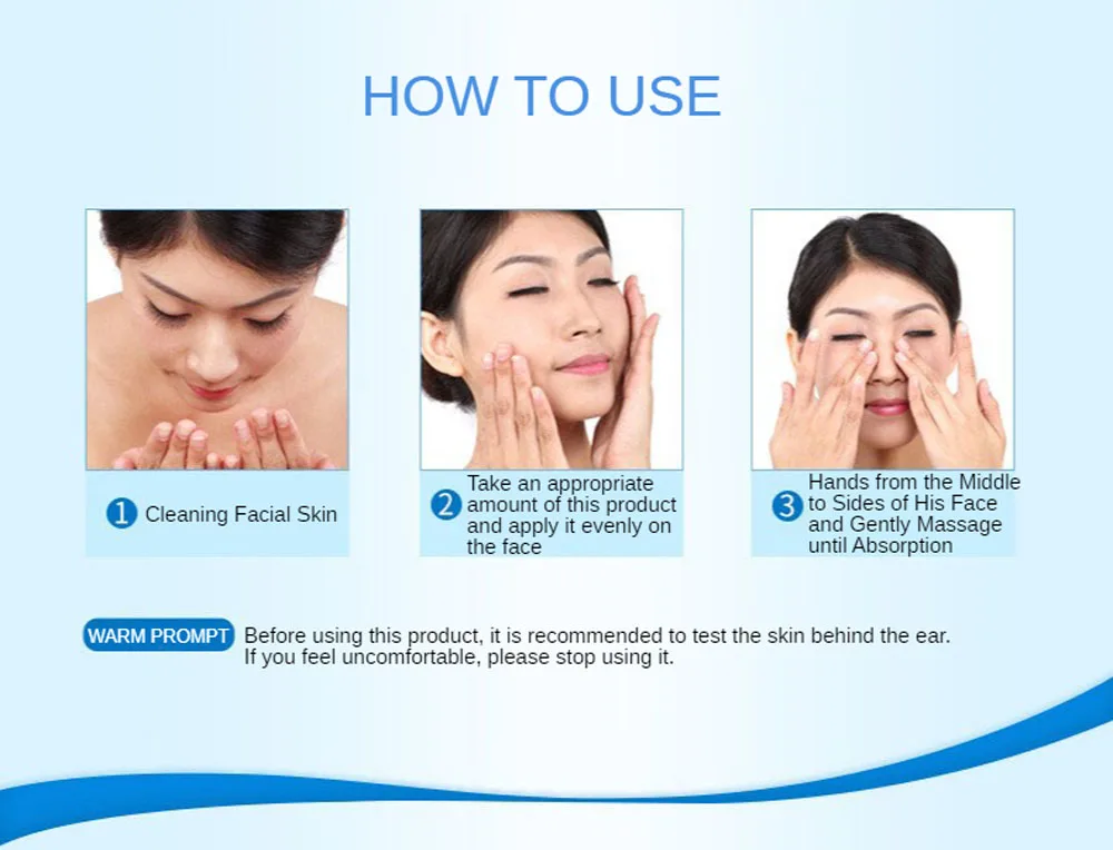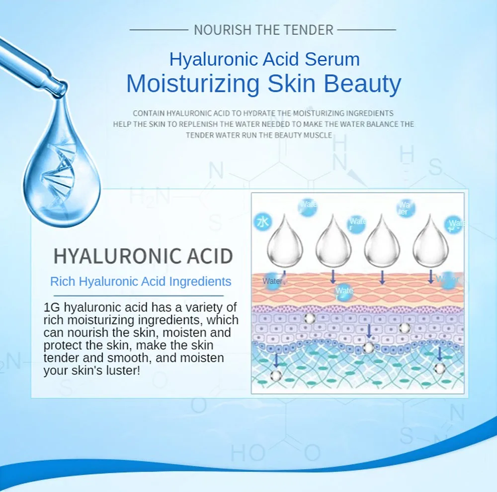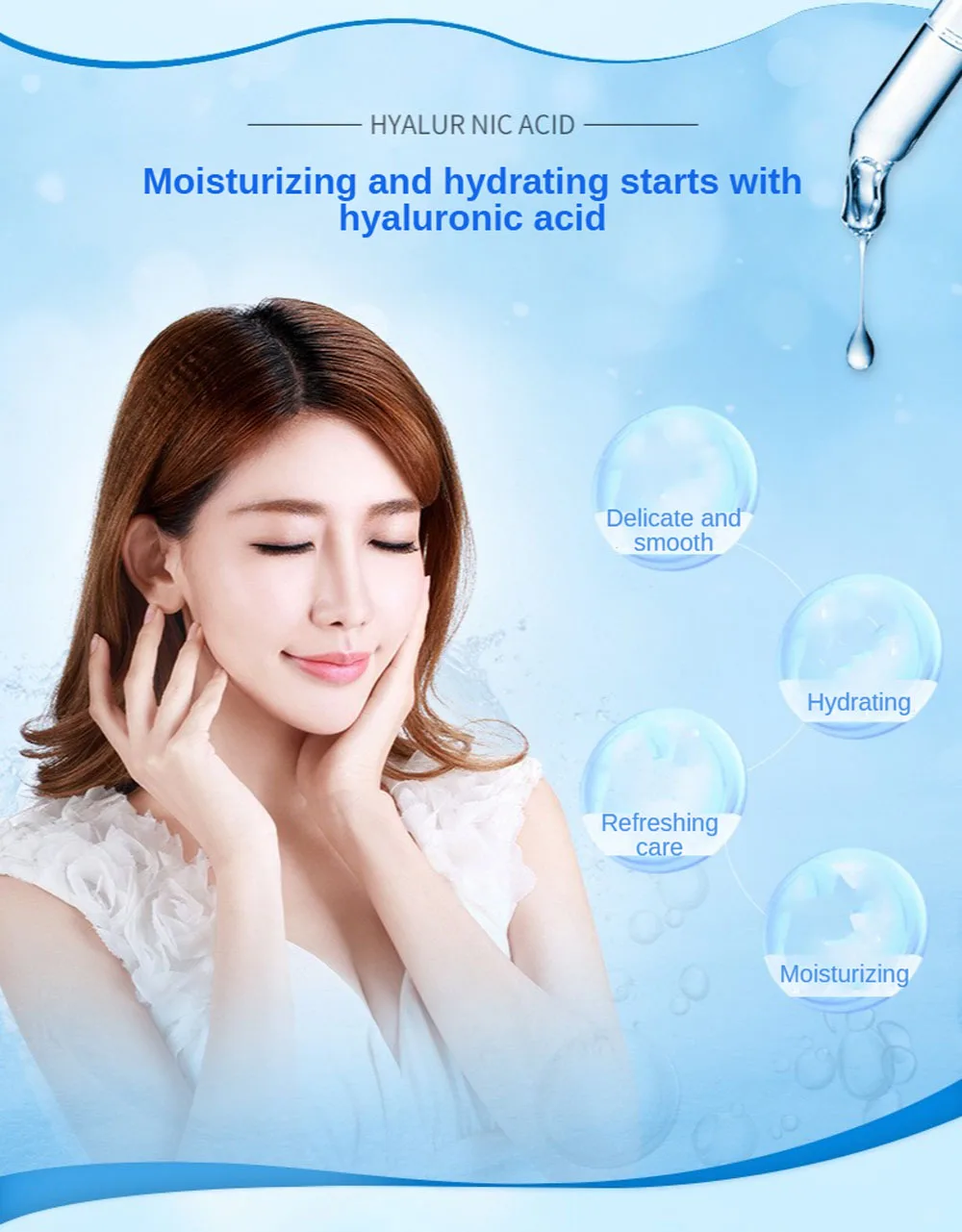 Сыворотка с гиалуроновой кислотой Увлажняющая красота кожи Богатые ингредиенты гиалуроновой кислоты 1 г гиалуроновой кислоты содержит множество богатых увлажняющих ингредиентов, которые питают кожу, увлажняют и защищают ее, делают ее нежной и гладкой, а также увлажняют блеск вашей кожи!