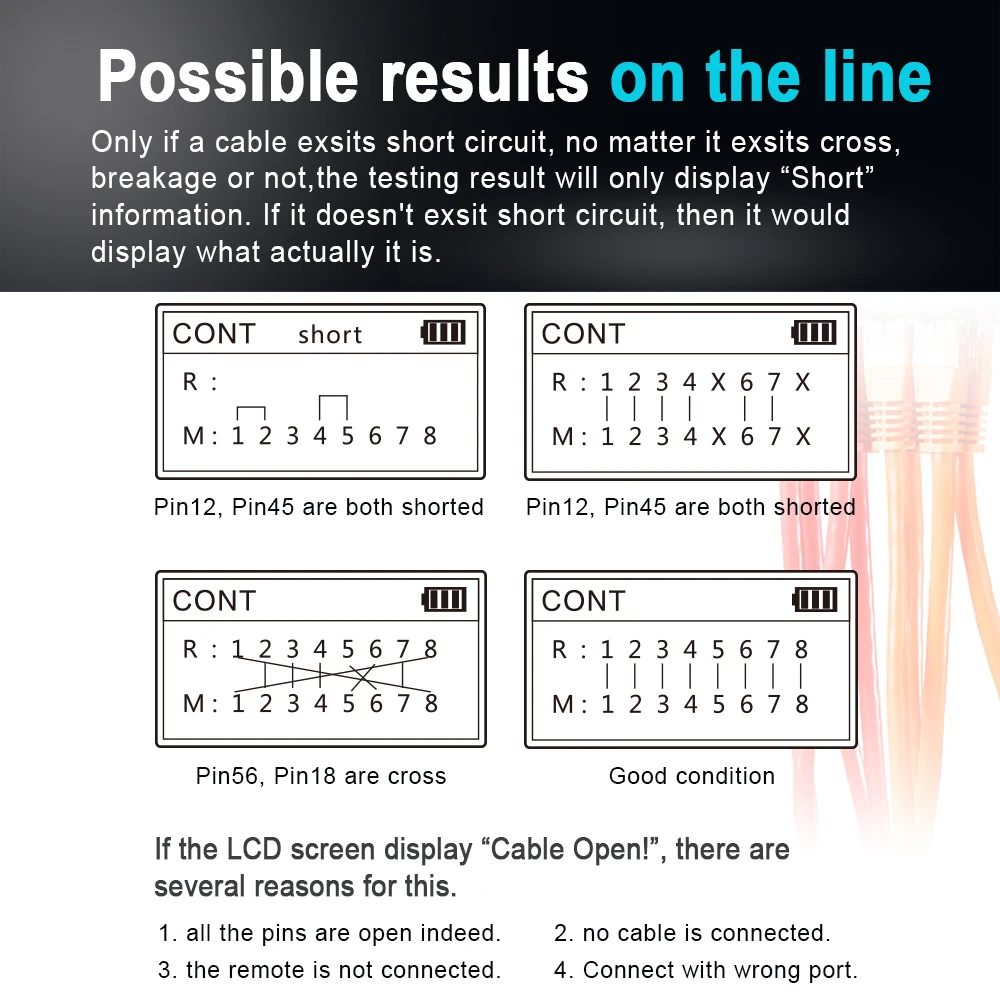 1. CONT-Test open, short, cross,ect для STP, UTP кабеля.2. Длина-Измерьте длину кабеля lan, радиус действия 2,5 м ~ 200 м.3. Сканирование-аналоговый/цифровой/PoE режим для определения местоположения кабелей lan.4. PoE-доступен для стандартных или нестандартных коммутаторов PoE (5 ~ 60 в), определяет стандарт AT или AF типа PSE.5. Вспышка-определение местоположения сетевого порта мигающим индикатором порта на коммутаторе/маршрутизаторе.