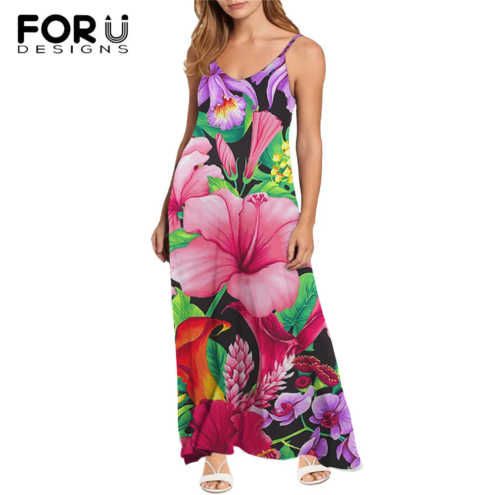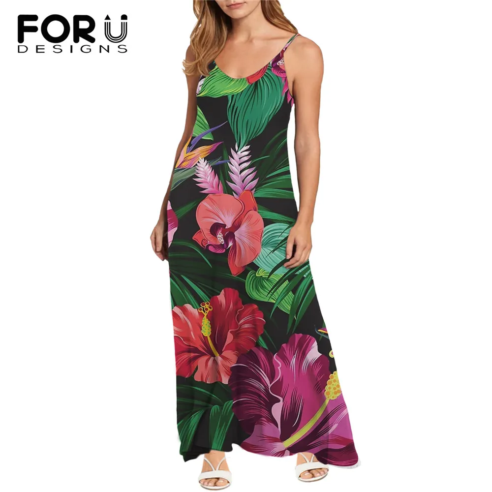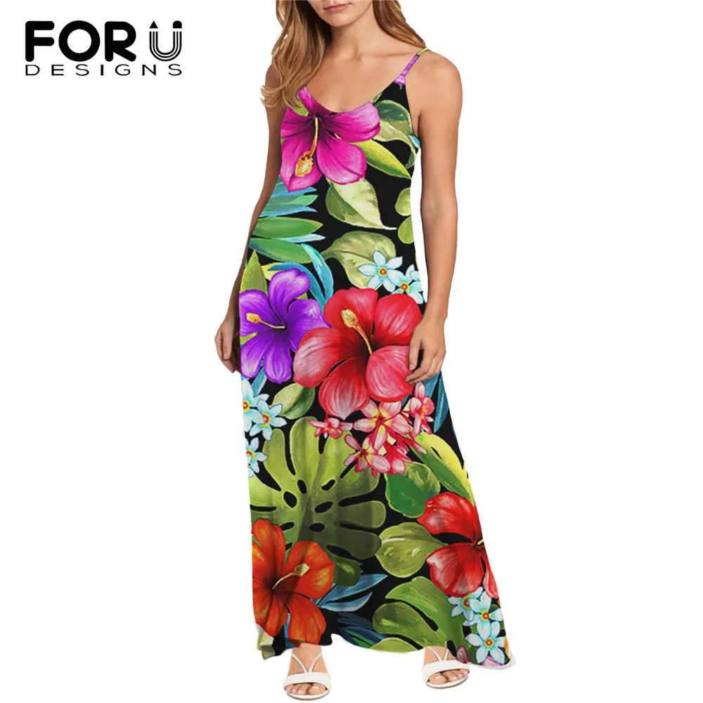 FORUDESIGNS, элегантное женское платье-комбинация с рисунком в гавайском стиле без рукавов, с Тропическими Цветами, летнее женское сексуальное пляжное Длинное Платье Макси