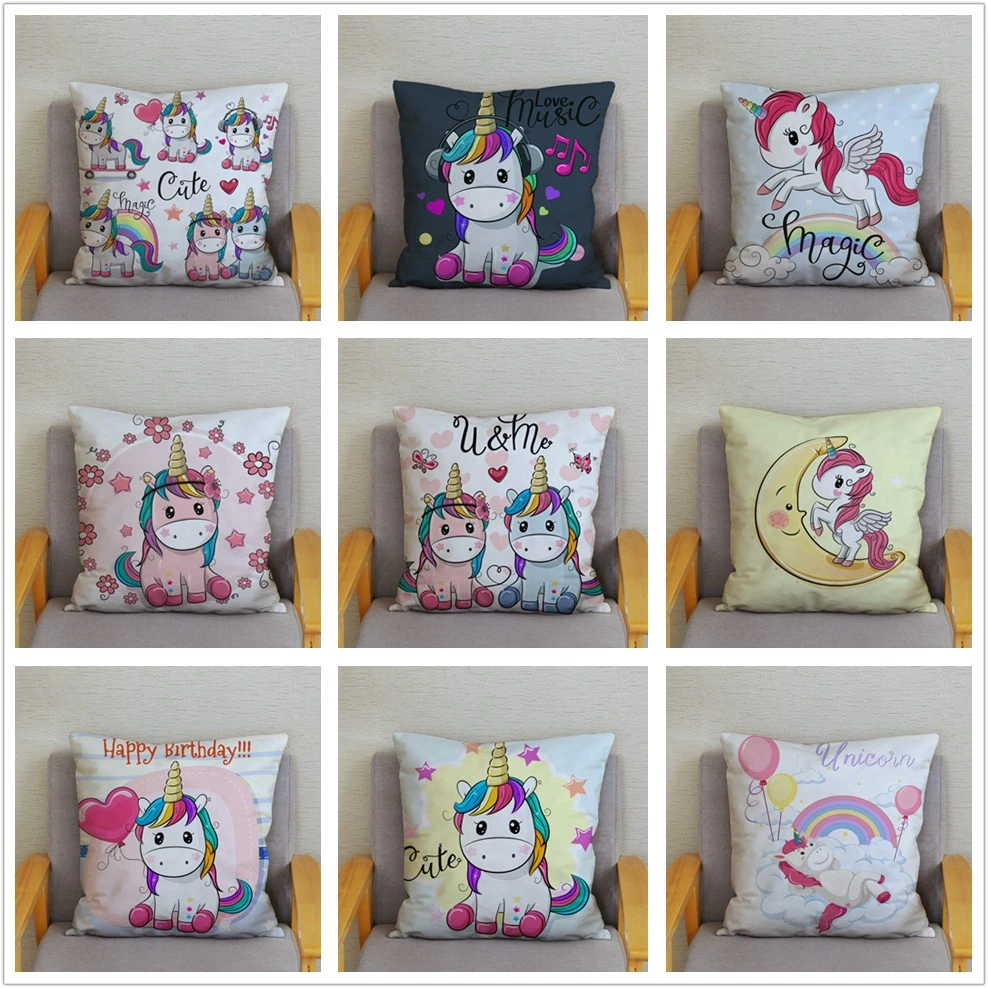Симпатичная наволочка с милым принтом единорога, наволочка с мультяшным рисунком, детский подарок, мягкие Полиэстеровые Чехлы для подушек 45*45, домашний декор для дивана