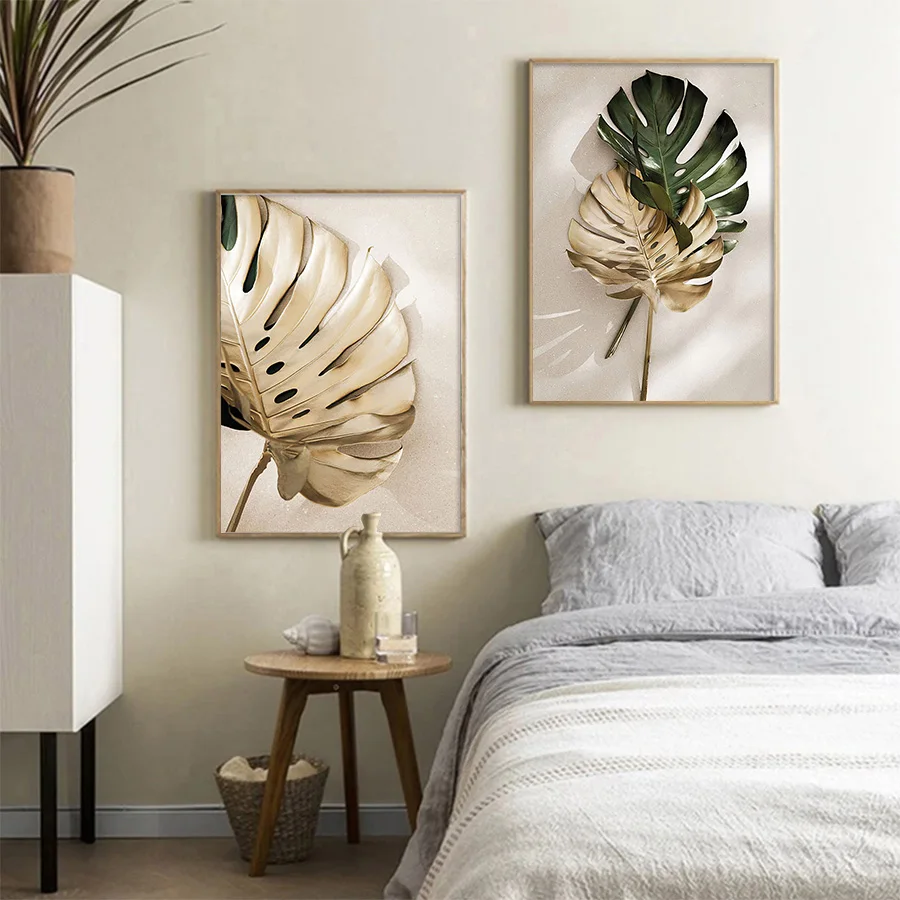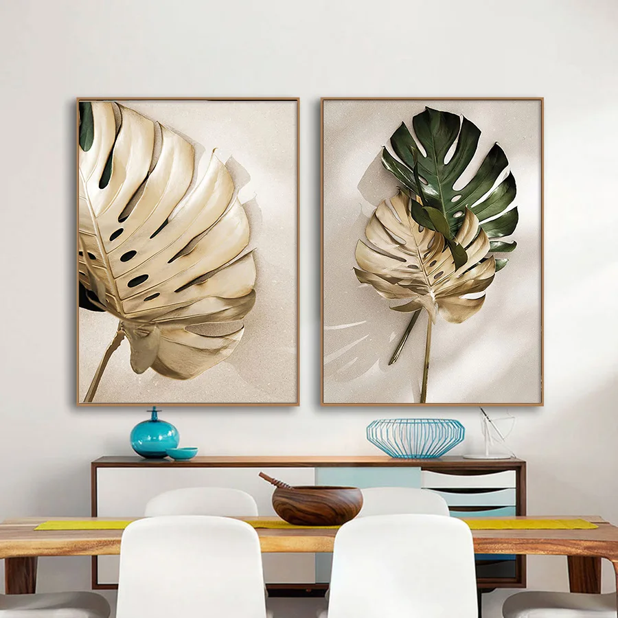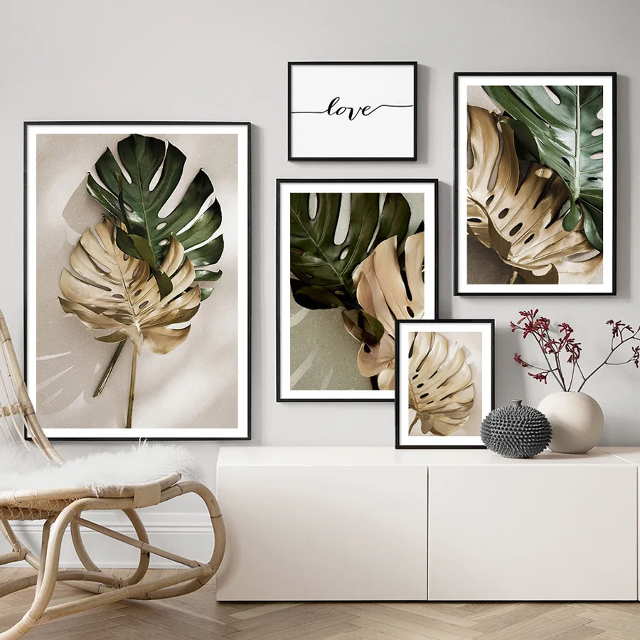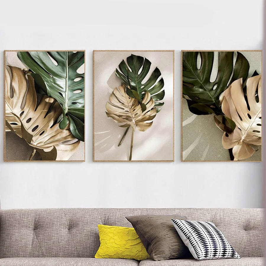 Настенная роспись, тропические зеленые растения, абстрактное искусство, холст, печать, золотой монстера, лист, плакат, Современная гостиная, роскошная картина
