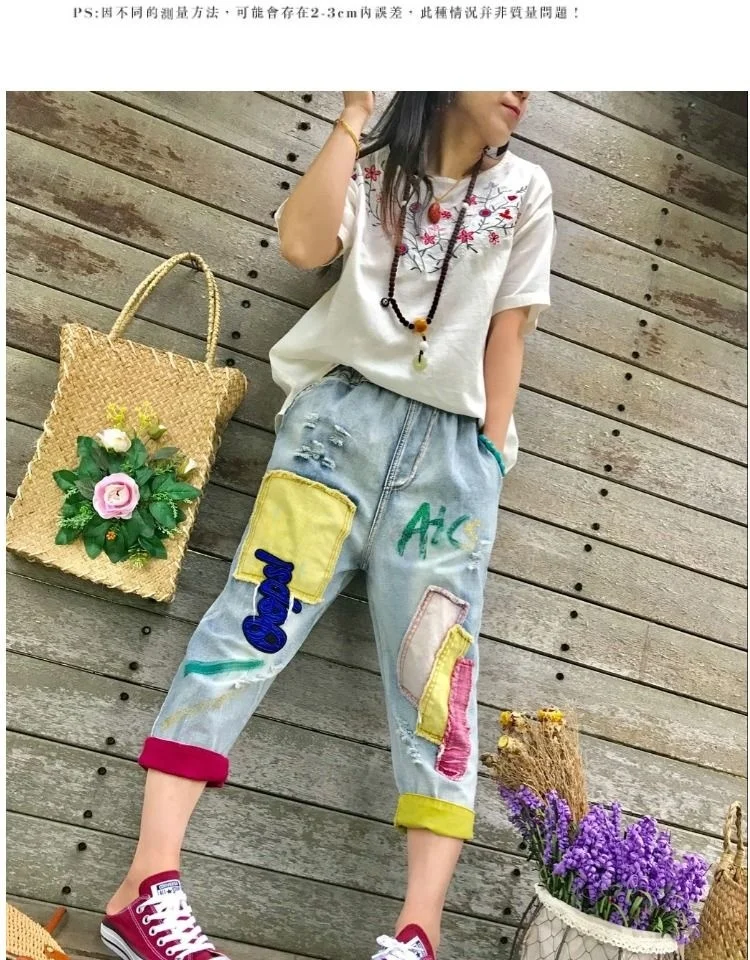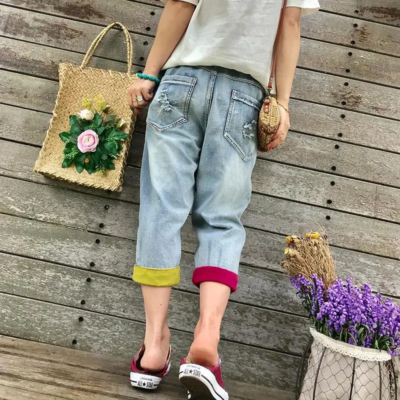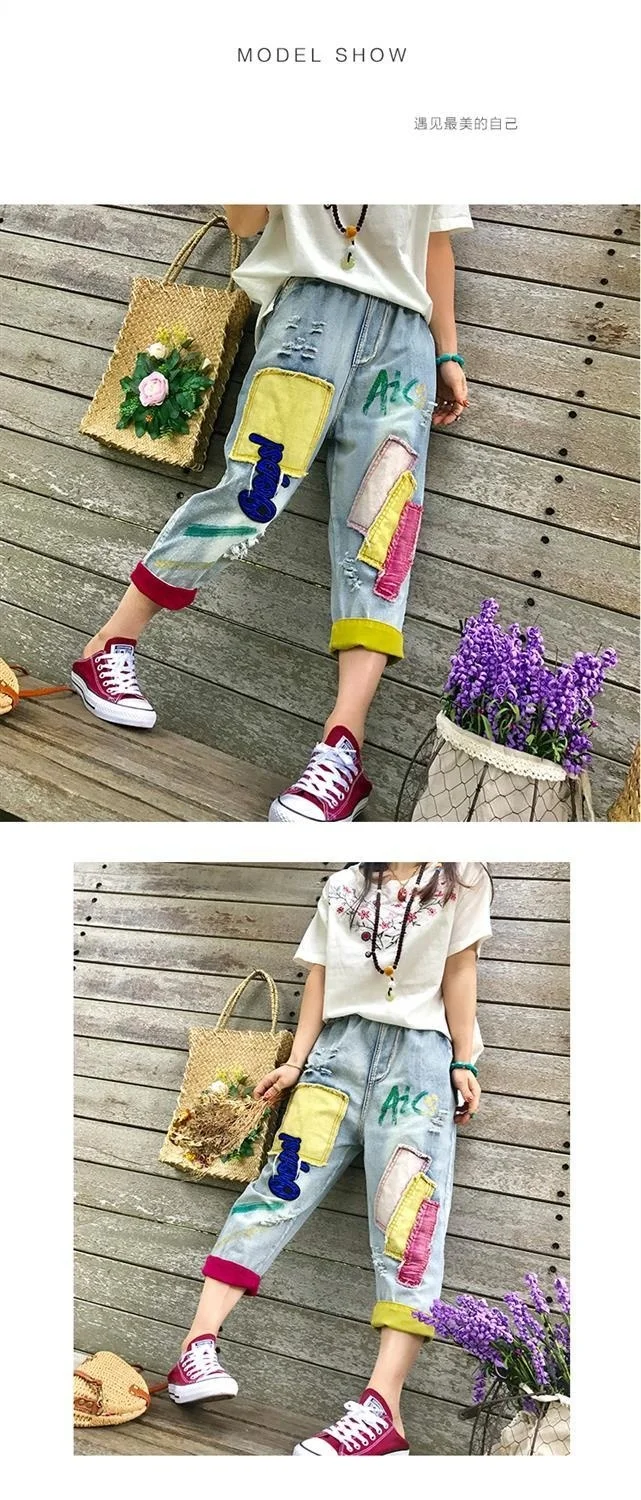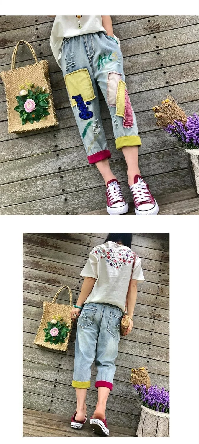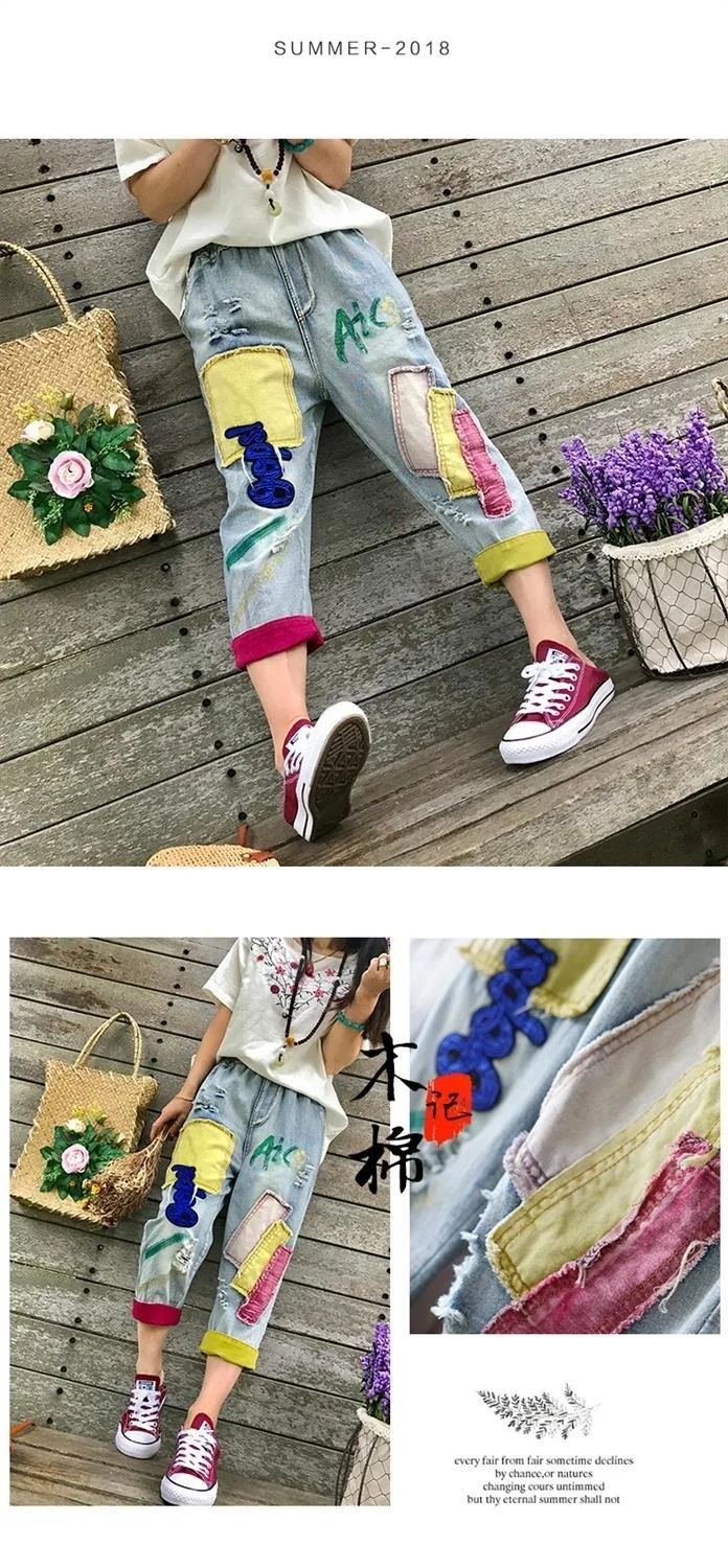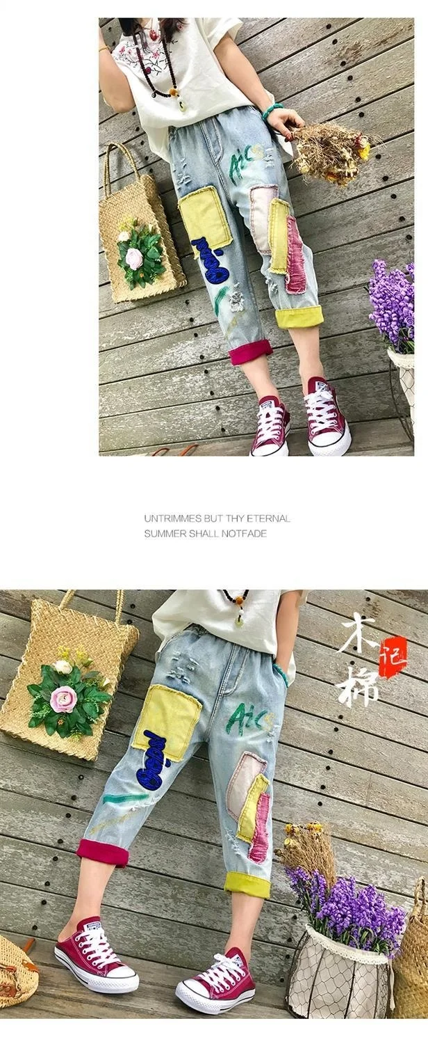 Летние тонкие ретро джинсы с вышивкой, эластичная резинка на талии, контрастные цвета, свободные большие джинсы, женские облегающие Капри