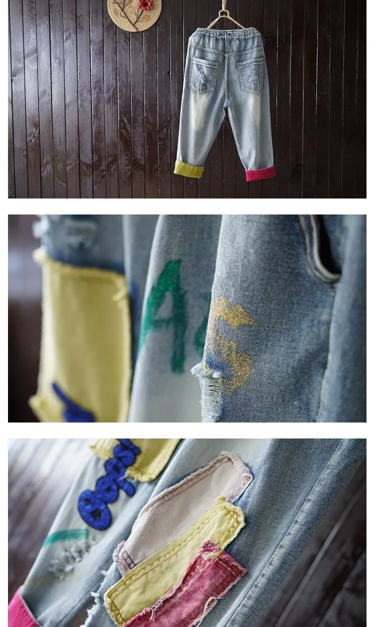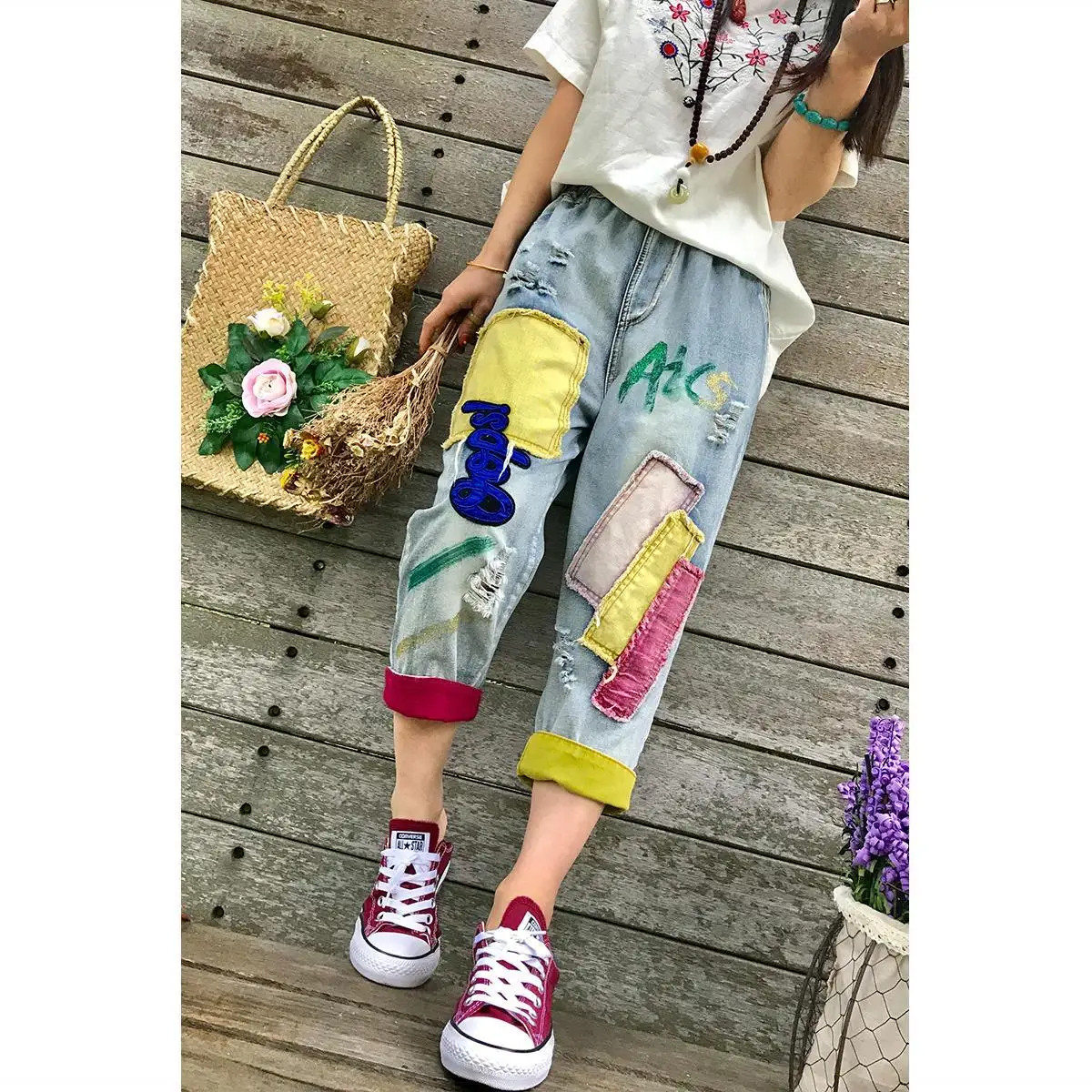 Женские узкие рваные джинсы, тонкие свободные рваные джинсы контрастных цветов с вышивкой в стиле ретро и эластичной талией, лето 2021