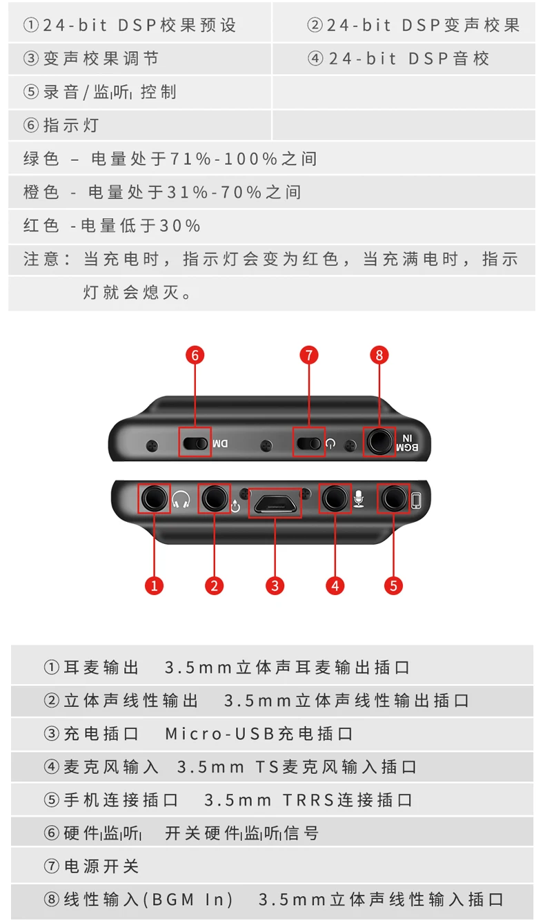 • 8-светодиодный измеритель уровня усиления микрофона и измерение уровня микрофона