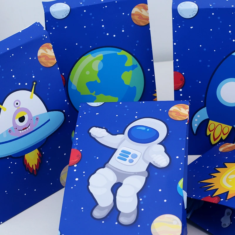 Бумажные пакеты для празднования дня рождения, подарочный пакет, Подарочная коробка для конфет, леденцов, астронавтов, ракета, Вселенная, тематическое событие, сумочка для подарков на заказ