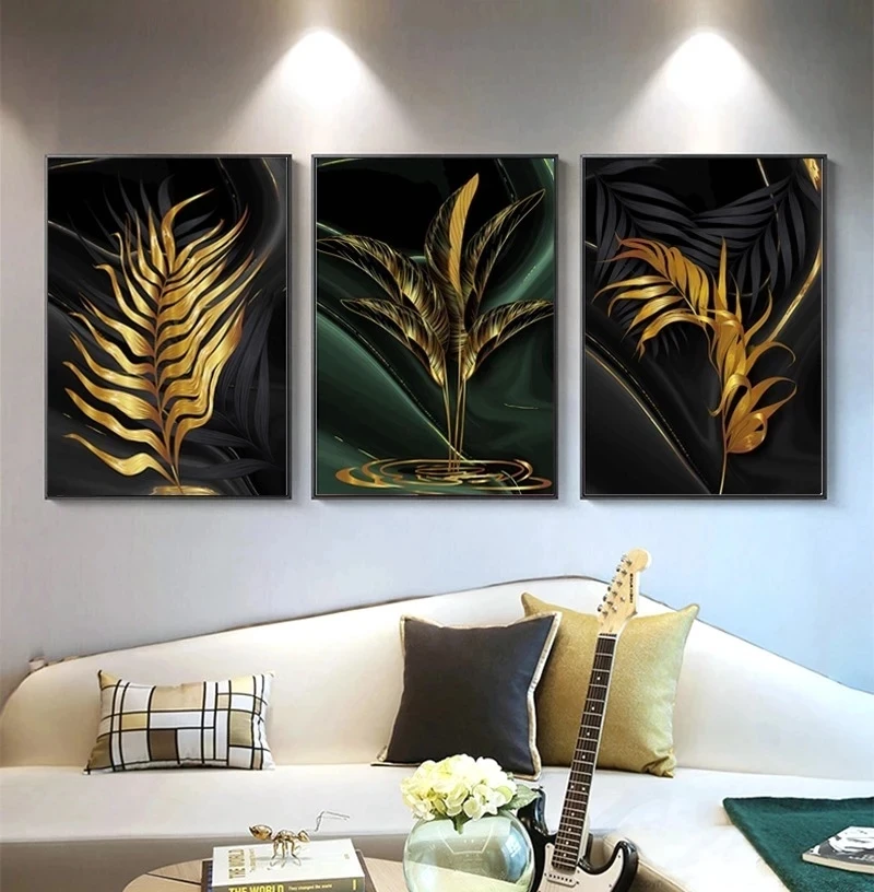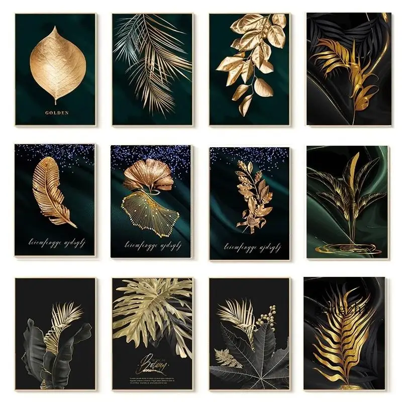 Настенный постер с черными и золотыми листьями, картины на холсте с...