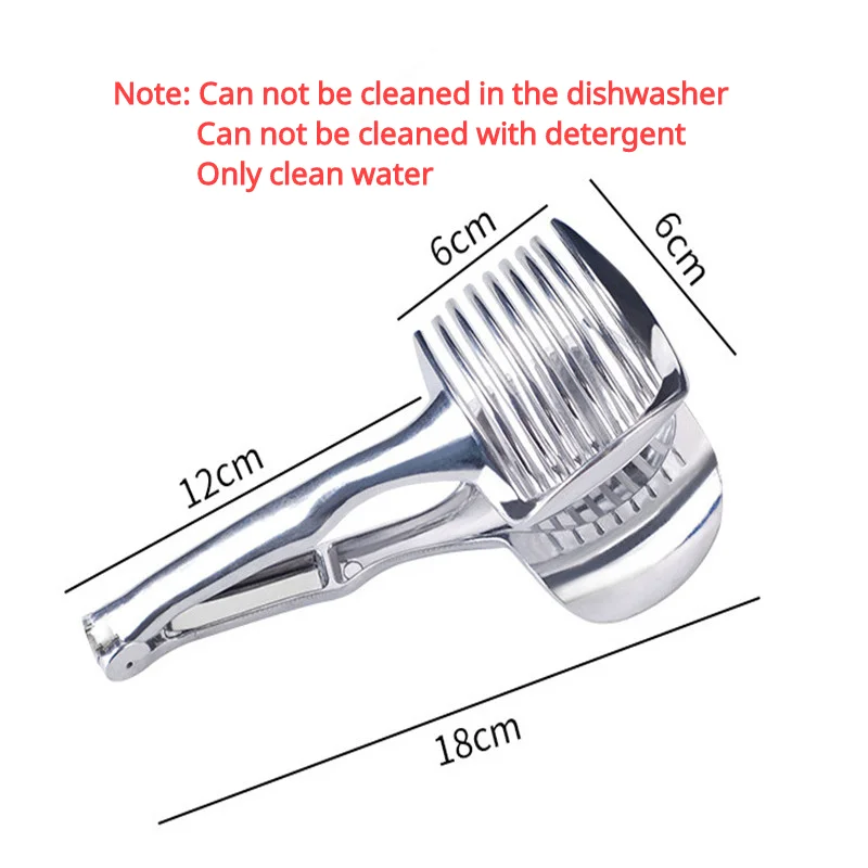 Название продукта: лимон, томатный слайсер Размер: около 18*6 см Материал: алюминиевый сплав из нержавеющей стали Использование: для нарезки картофеля, лимонов, томатов и других фруктов Упаковочный лист: слайсер * 1