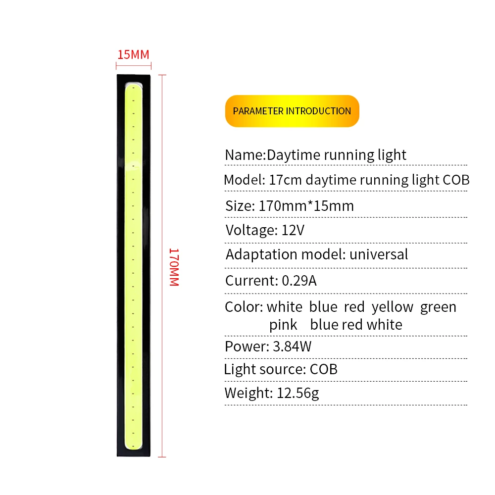 Характеристики: Мощность: 3,84 Вт каждая штукаВходное напряжение: DC10V-12VМатериал: пластик и металлЦвета: белый/синий/голубой/красный/желтый/зеленыйЦветовая температура: 6000K-8000KПрименение транспортного средства: УниверсальныйВес нетто: 14 гРазмеры: 17,4 см x 1,5 см x 0,5 см Размер упаковки (Д х Ш х В):Срок службы: 100000 часовПосылка включает: 2x COB светодиодный дневные ходовые огни