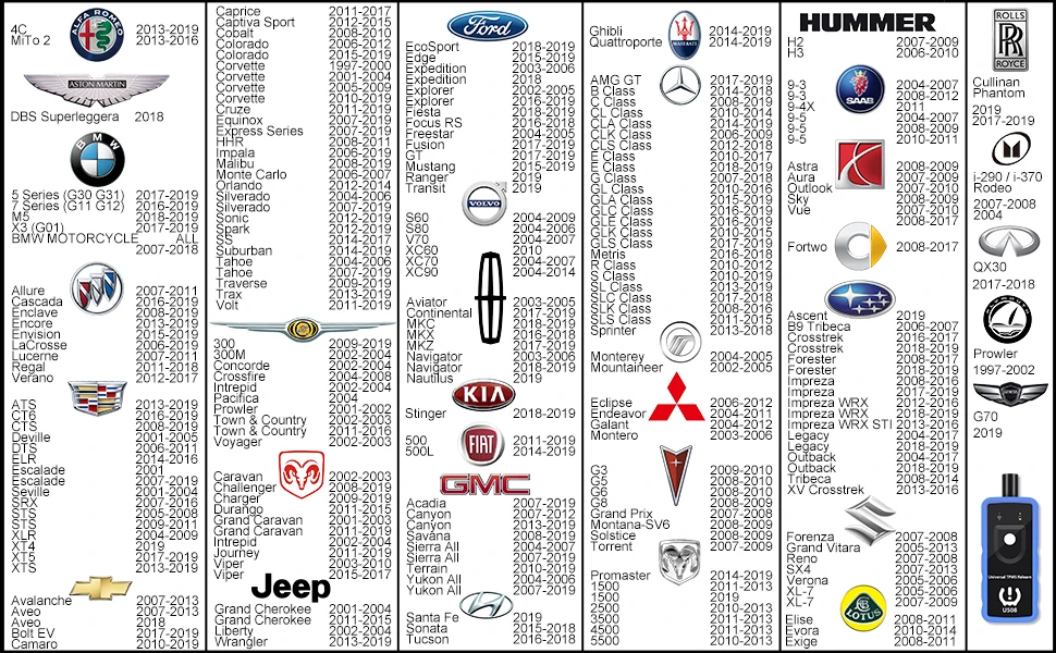 Универсальный инструмент TPMS realern совместим с большинством автомобилей марки: для Alfa Romeo, BMW, Buick, Cadillac, chevrollt, Chrysler, Dodge, Fiat, Ford, GMC, Hummer, Hyundai, Infiniti, isuzu, Jeep, Kia, Lincoln, Lotus, Maserati, Mercedes-Benz, Mercury, Mitsubishi, Pontiac, Ram, Retrofit, Rolls Royce, Saab, Saturn, Subaru, Suzuki, Volvo ect, поддержка модели до 2019 года.[Не для Nissan Xtrail, Porsche Cayenne Panamera]