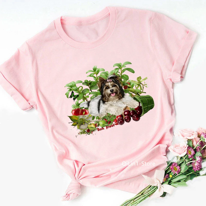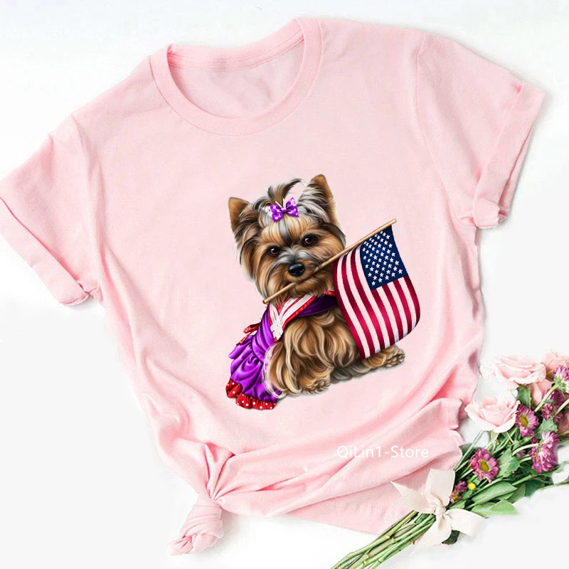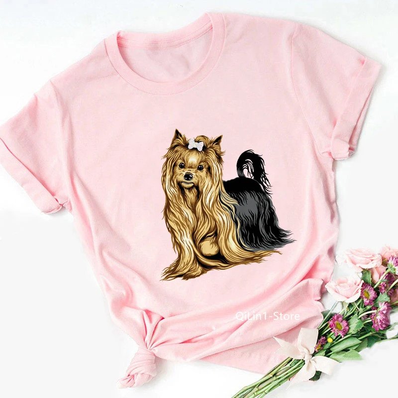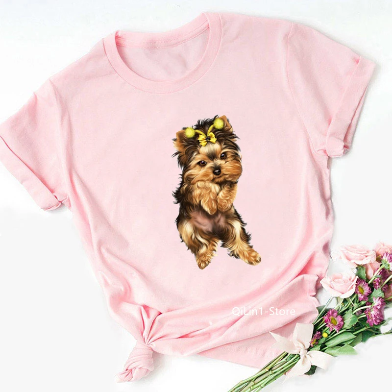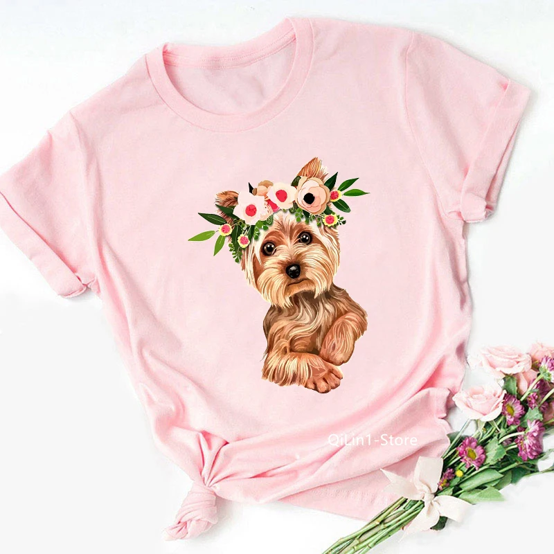 Футболка женская летняя розовая с принтом в виде собаки йоркширского терьера и цветов