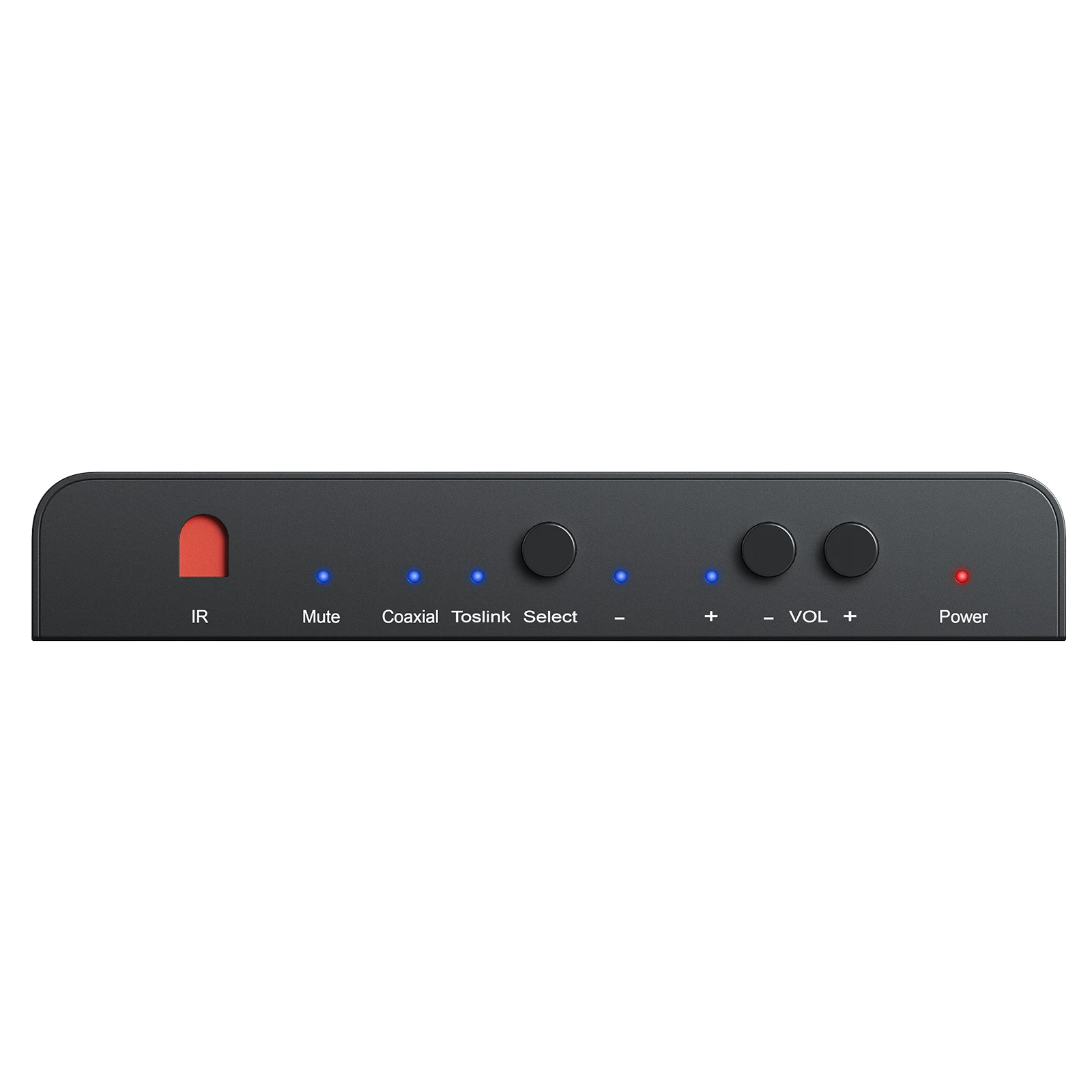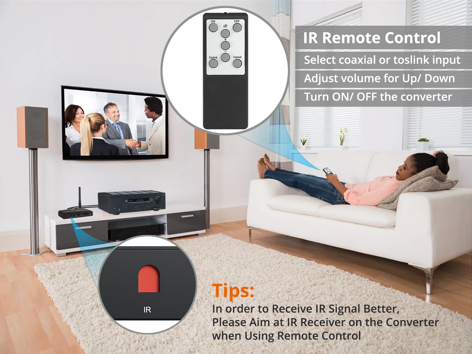3. ИК-пульт дистанционного управления, с ИК-беспроводным пультом дистанционного управления, легко регулировать громкость/выбрать коаксиальный или toslink вход/Выключить/включить или выключить с помощью ИК-беспроводного пульта дистанционного управления. Для получения сигнала лучше, пожалуйста, убедитесь, что пульт находится перед инфракрасным ИК-индикатором на конвертере.