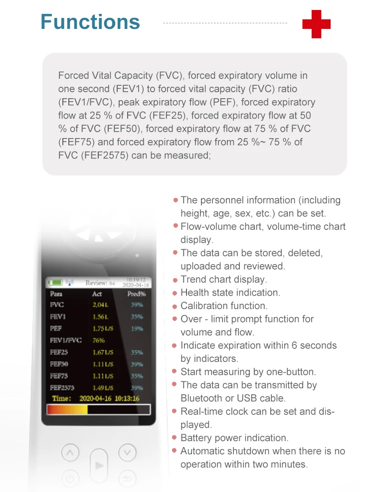1) параметры, включая FVC, FEV1, FEV1/FVC и PEF, могут быть измерены.2) Настройка персональной информации, включая рост, возраст, пол и т. д.3) индикация состояния здоровья.4) передача Bluetooth.5) функция просмотра данных и чехол.6) индикация низкого заряда батареи.7) Отображение и настройка часов в режиме реального времени.8) функция автоматического отключения питания.9) устройство массового хранения, хранит до 9999 чехлов