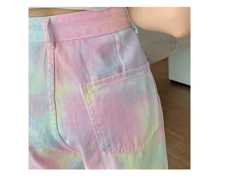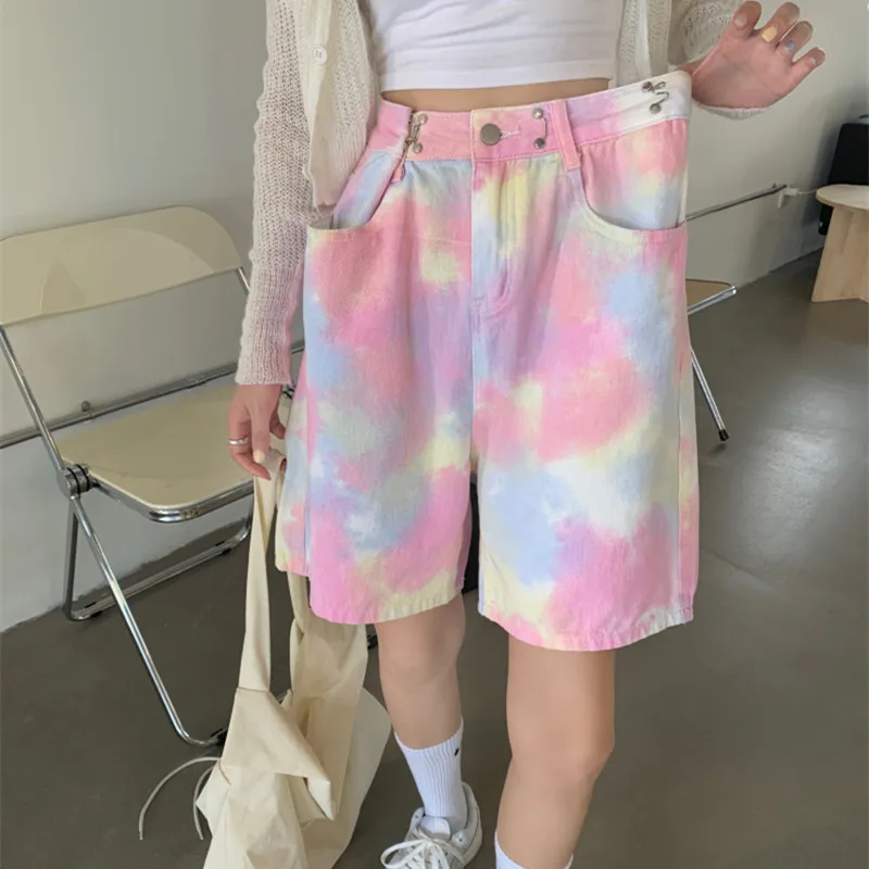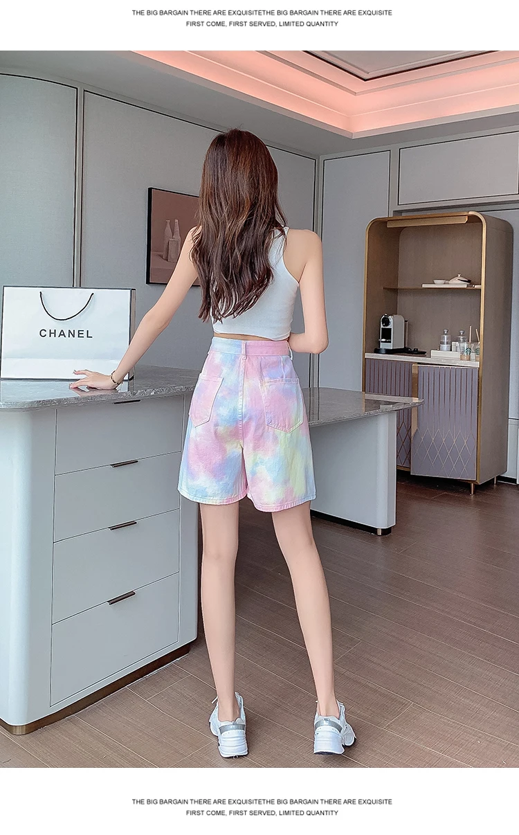 Женские летние джинсовые шорты с высокой талией, Регулируемые Прямые и градиентные свободные шорты из денима с радужным принтом, P009, 2021