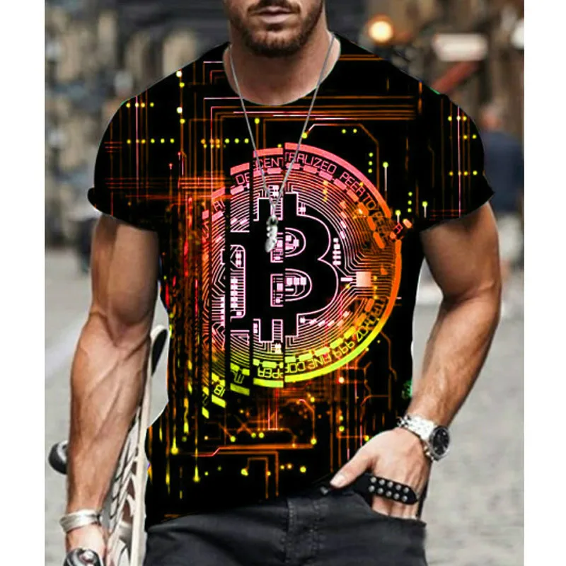 Мужская спортивная футболка с коротким рукавом, свободная футболка с круглым вырезом и 3D принтом биткоинов, дышащая повседневная одежда для воркаута, Новое поступление 2021