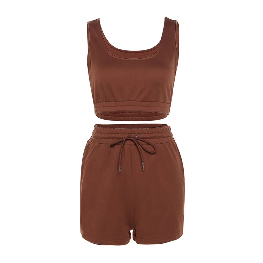 Комплект Спортивный женский из двух предметов, укороченный топ и шорты на шнурках, однотонный комплект, спортивный костюм, лето 2021