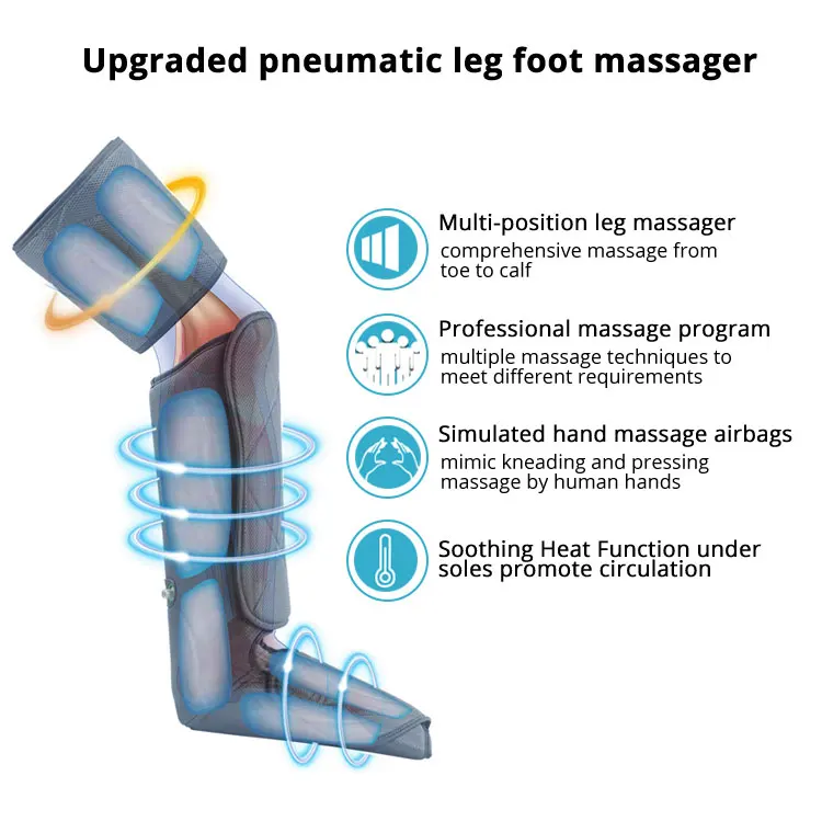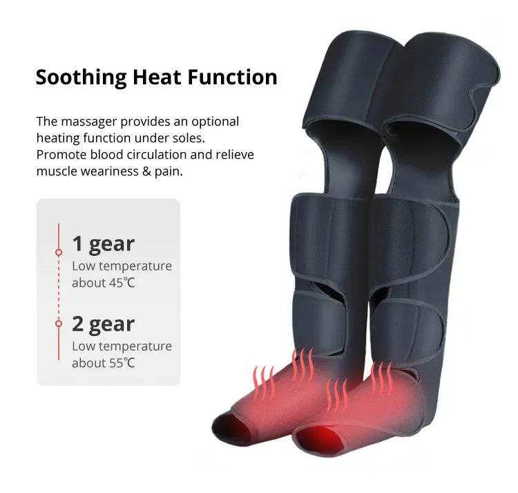 1. Массаж ног и икр-этот воздушный массажер для ног и ног используется для массажа ног и икр, 2x3 подушки безопасности внутри, сожмите стопу и икронообразную мышцу от носка до икры, чтобы снять усталость и улучшить кровообращение.2,3 режима и 2 интенсивности-6 режимов массажа, 3 интенсивности и 2 температуры для обеспечения различного массажа.3. Успокаивающая Функция нагрева для того, чтобы повысить циркуляцию и предложить более профессиональный опыт массажа, массажер обеспечивает дополнительную функцию нагрева под подошвой. Высококачественный нагревательный хлопок сохраняет ваши ноги в тепле, способствует циркуляции крови и снимает усталость и боль в мышцах.4,3 интенсивность 3 интенсивности для массажера ног: слабый, средний и сильный. Если вы используете его в первый раз, вы можете начать со слабой настройки и построить там. Затем Настройте интенсивность в соответствии с вашими ощущениями. Вы будете наслаждаться более комфортным массажем, следуя этой инструкции.5,6 режимов, облегчающих мышцы ног и ног массажер может обернуть все ваши икры и ноги для большинства людей. 2*3 подушки безопасности и 6 режимов массажа позволяют сжимать большинство частей ног и икр, что помогает расслабить мышцы, способствует циркуляции крови и снимает РЛС/отеки/лимфемы.6,10 минут автоматическое отключение ног Массажер будет отключен автоматически при использовании в течение 10 минут, что является правильным для массажа. Эта функция особенно полезна, чтобы избежать чрезмерного использования, когда люди засыпают или забывают выключить ее во время наслаждения массажем.