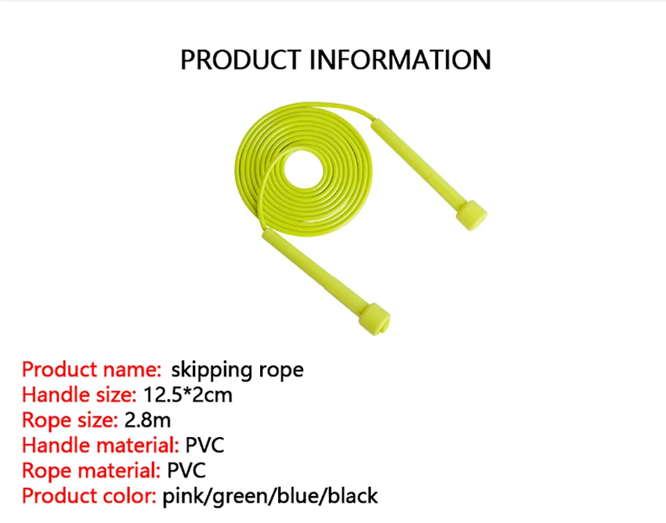 Характеристики: Тип: Скакалка Размер рукоятки: 12,5 см * 2 см Длина веревки: 2,8 м Цвет: черный/розовый/зеленый/желтый Посылка включает в себя: 1 шт. * скакалка Примечание: Все вышеуказанные размеры измеряются вручную, могут быть некоторые ошибки только для справки, пожалуйста, обратитесь к фактическому продукту! Из-за светильник, возможна небольшая разница в цвете из-быть s светильник ly отличается от реального цвета изделия.