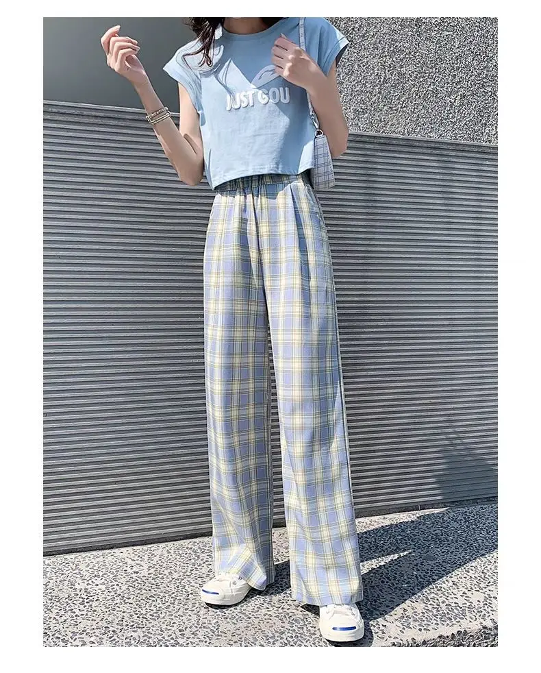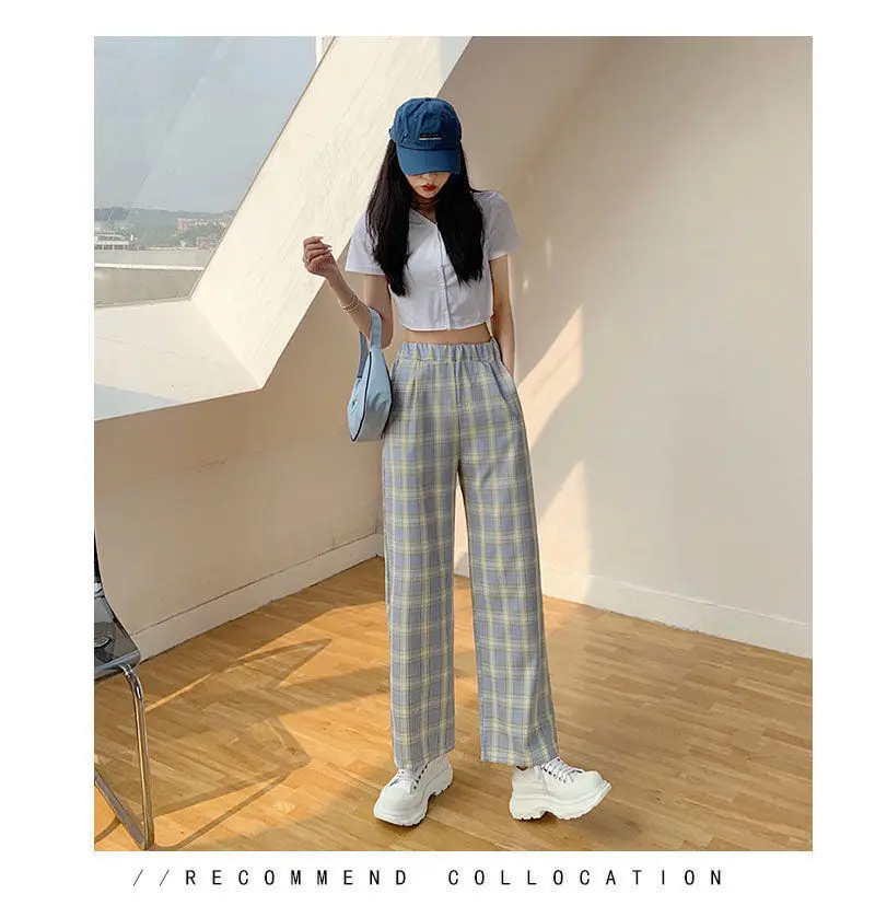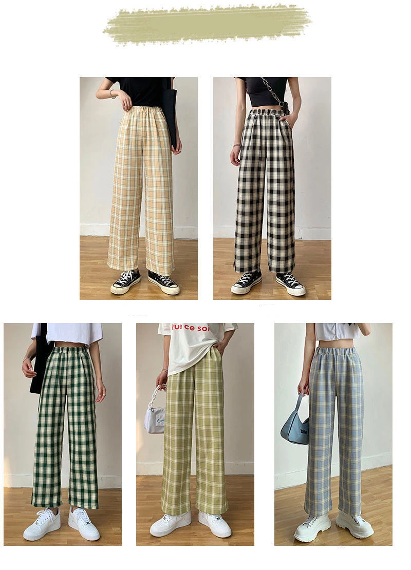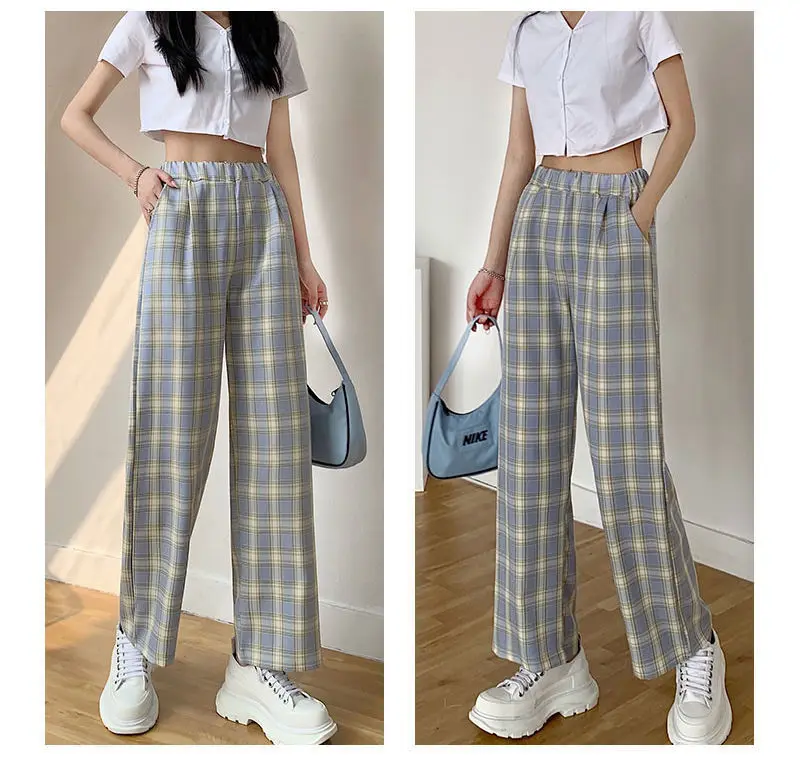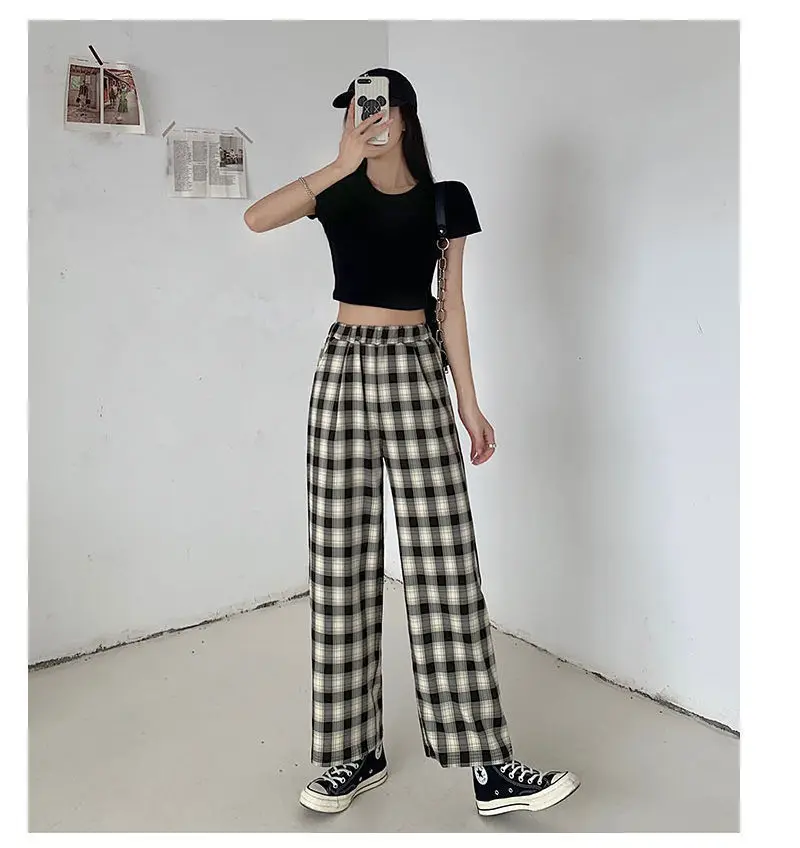 Простые женские брюки с эластичным поясом, ретро клетчатые повседневные длинные женские брюки, модные прямые широкие брюки, модная уличная одежда