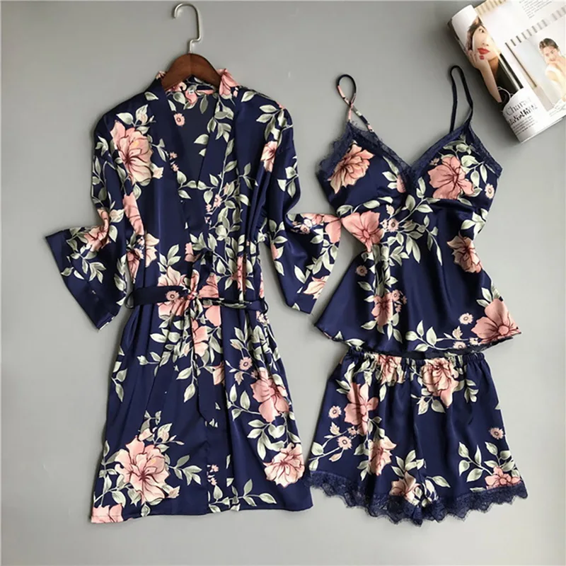 Материал: полиэстерТип: принтЖенская атласная Свадебная Пижама, Весенняя Пижама с кружевной отделкой, пижамный комплект с цветочным принтом, одежда для сна, Повседневная Домашняя одежда, комплект нижнего белья.